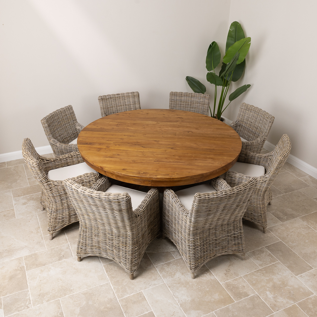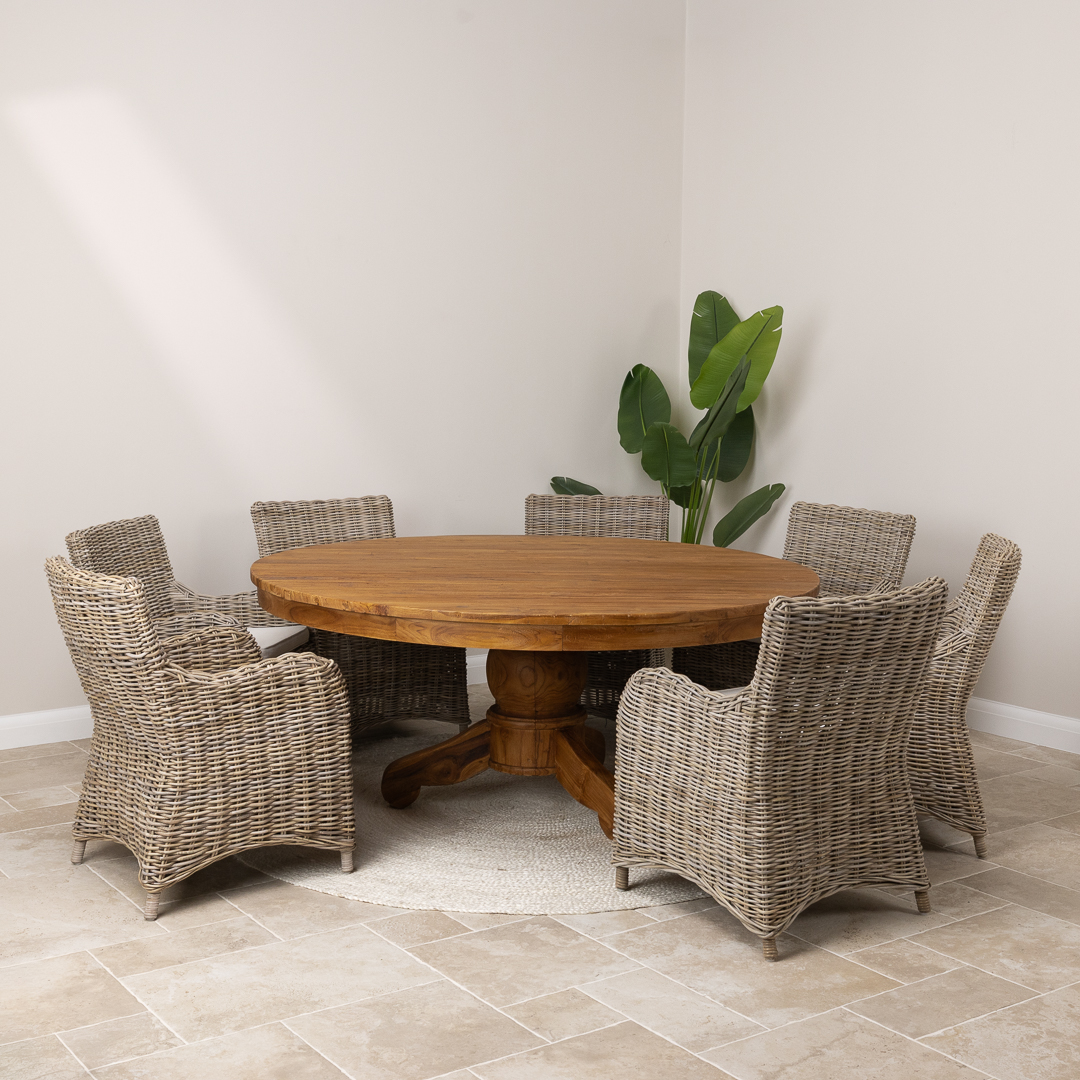 180cm Circular Rustic Reclaimed Teak Pedestal Indoor Dining Table with 8 Natural Kubu Wicker Chairs