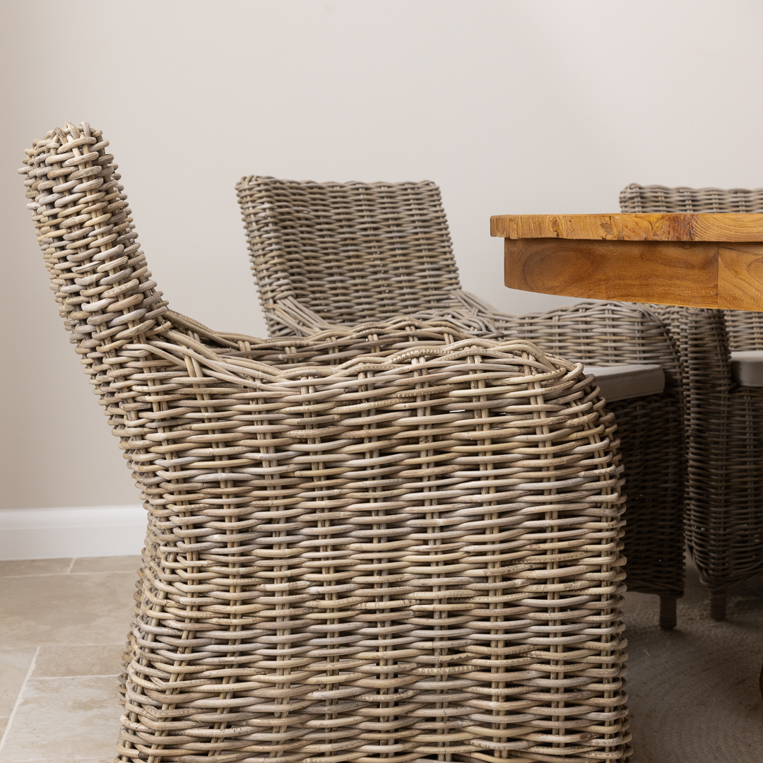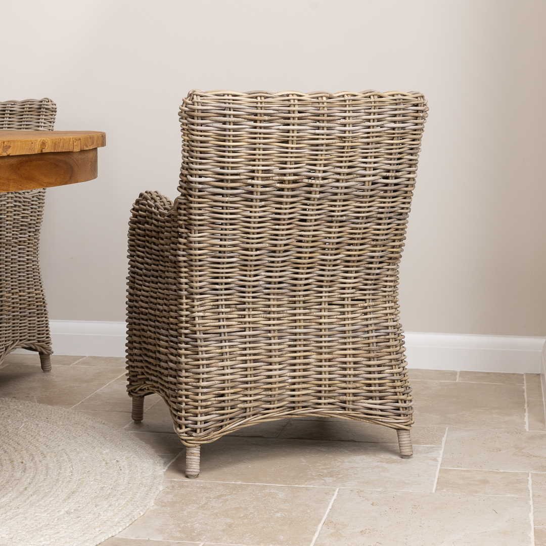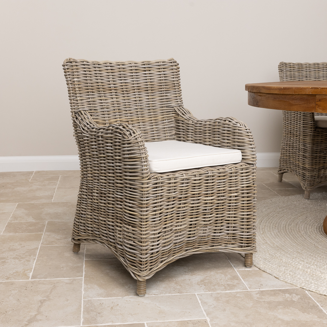 Natural Kubu Wicker Indoor/Outdoor Scroll Dining Armchair with Natural Linen CushionIn stock