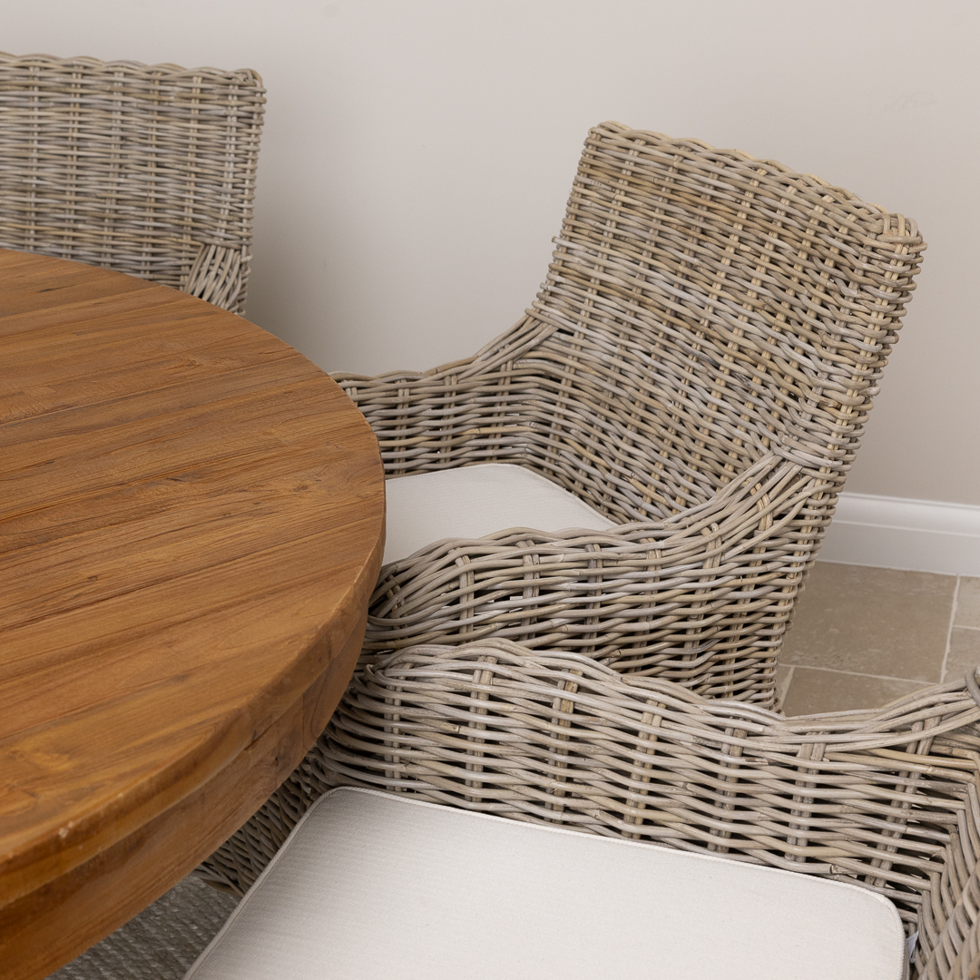 120cm Circular Rustic Reclaimed Teak Pedestal Indoor Dining Table with 4 Natural Kubu Wicker ChairsIn stock