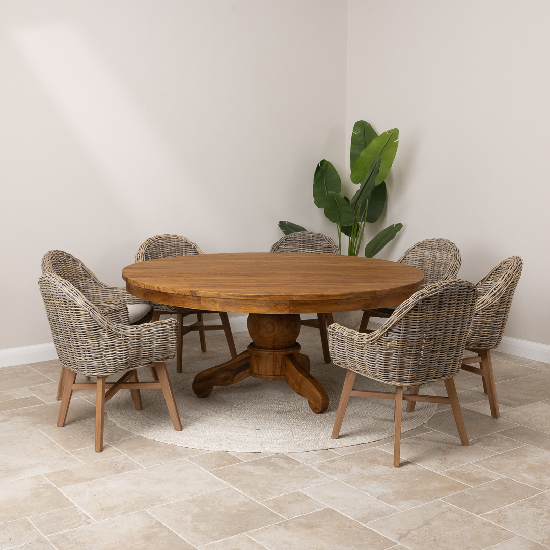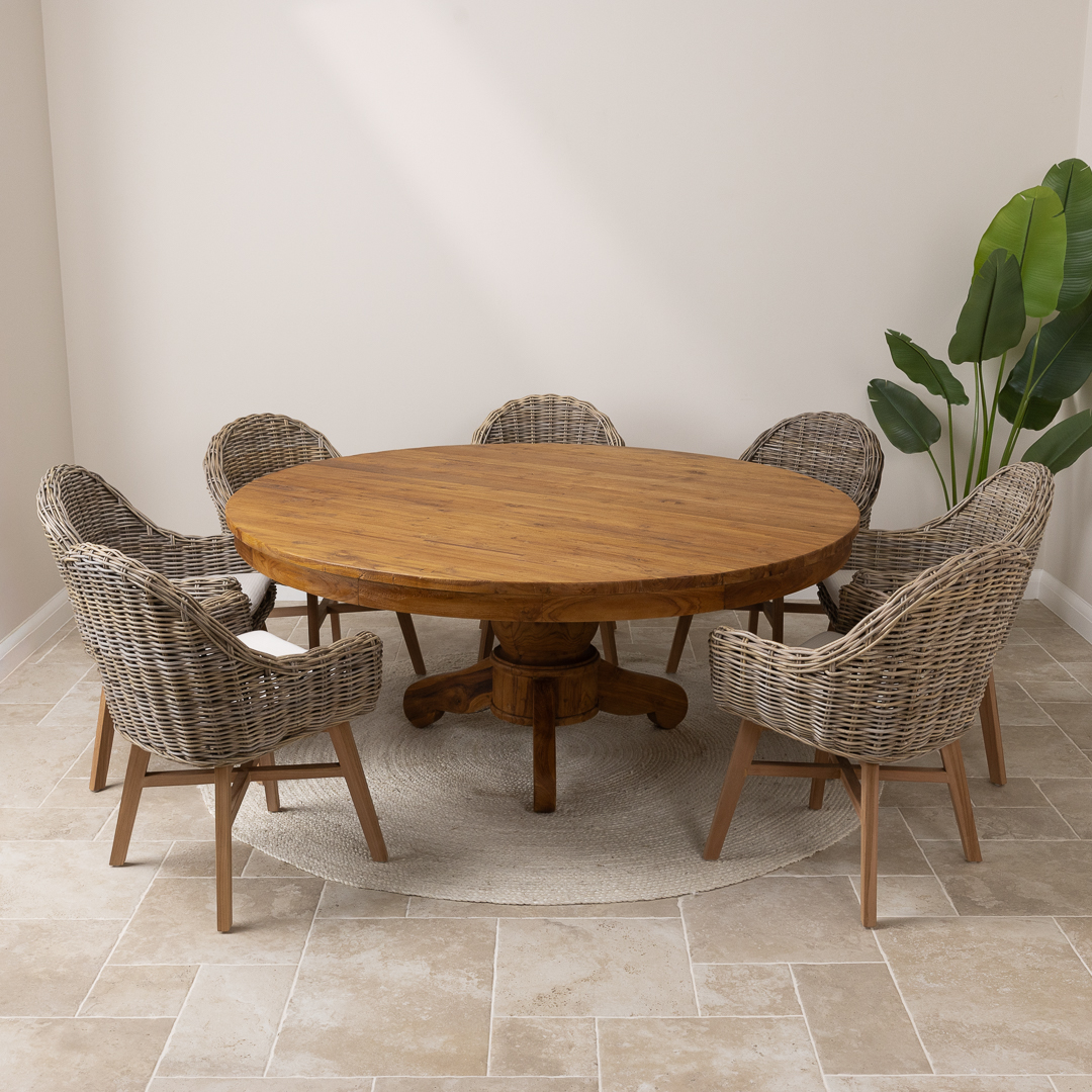 150cm Circular Rustic Reclaimed Teak Pedestal Indoor Dining Table with 6 Natural Kubu Wicker ChairsIn stock