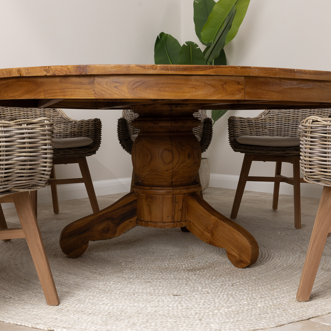 180cm Circular Rustic Reclaimed Teak Pedestal Indoor Dining Table with 8 Natural Kubu Wicker ChairsIn stock