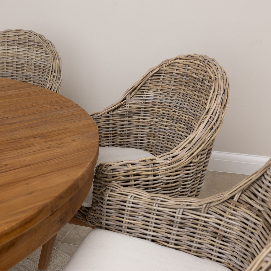 120cm Circular Rustic Reclaimed Teak Pedestal Indoor Dining Table with 4 Natural Kubu Wicker ChairsIn stock