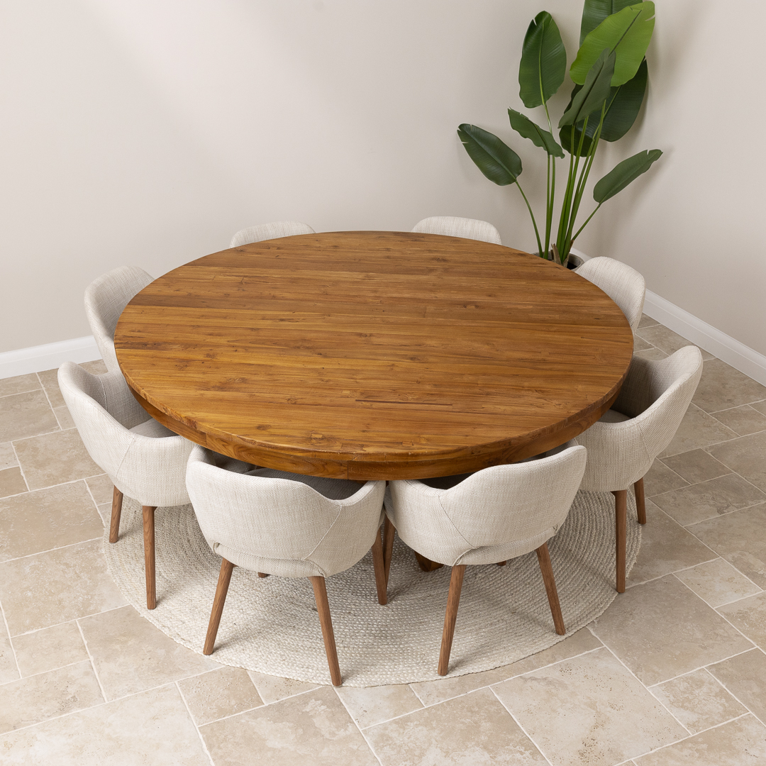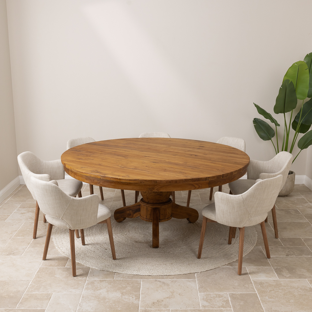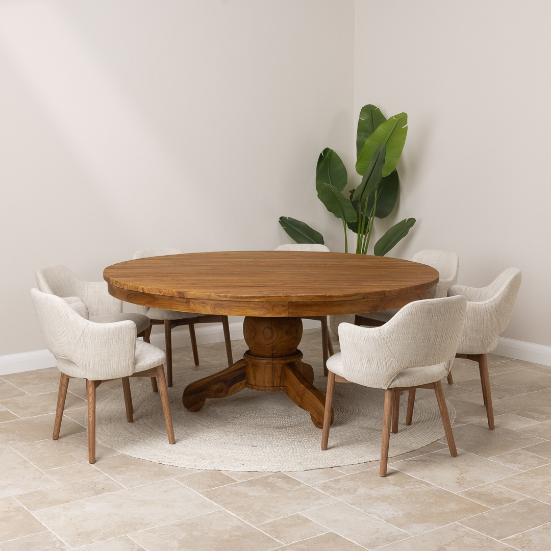 180cm Circular Rustic Reclaimed Teak Pedestal Indoor Dining Table with 8 Upholstered Cove ChairsIn stock