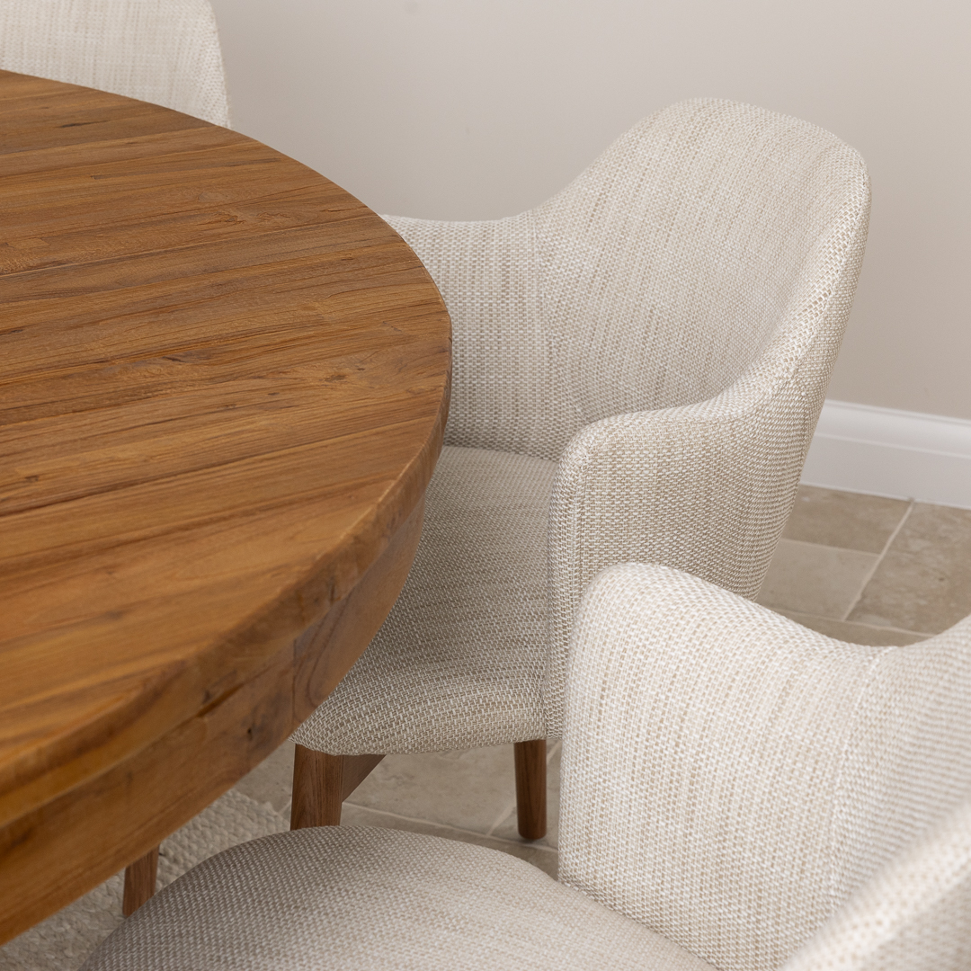 150cm Circular Rustic Reclaimed Teak Pedestal Indoor Dining Table with 6 Upholstered Cove ChairsIn stock