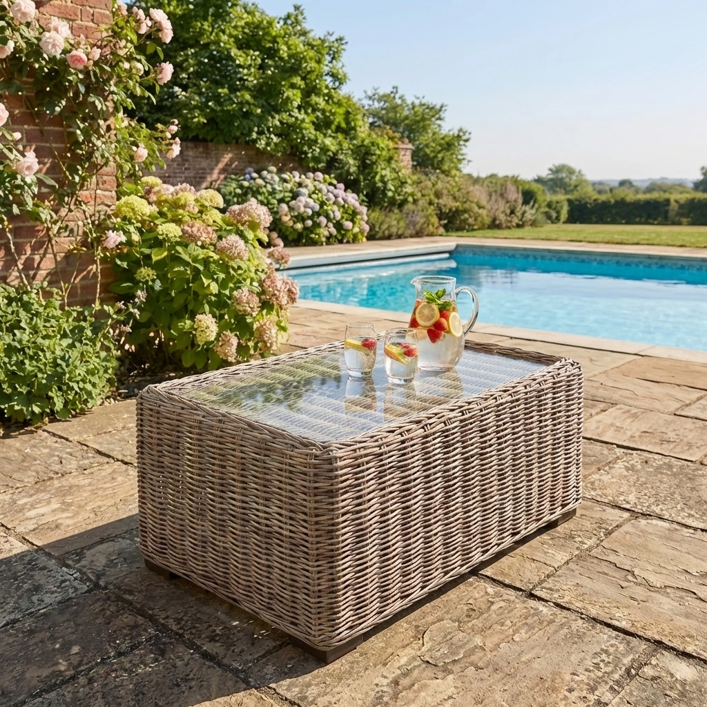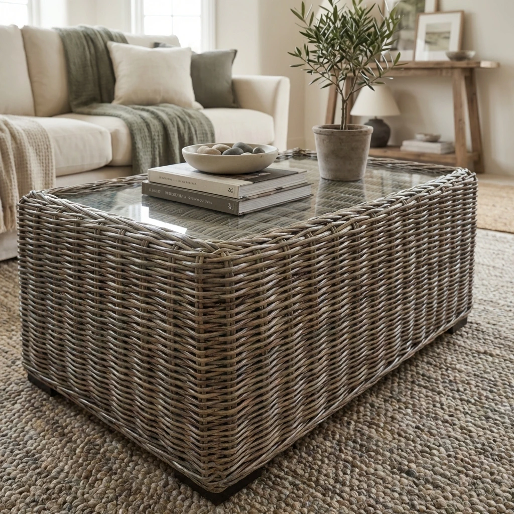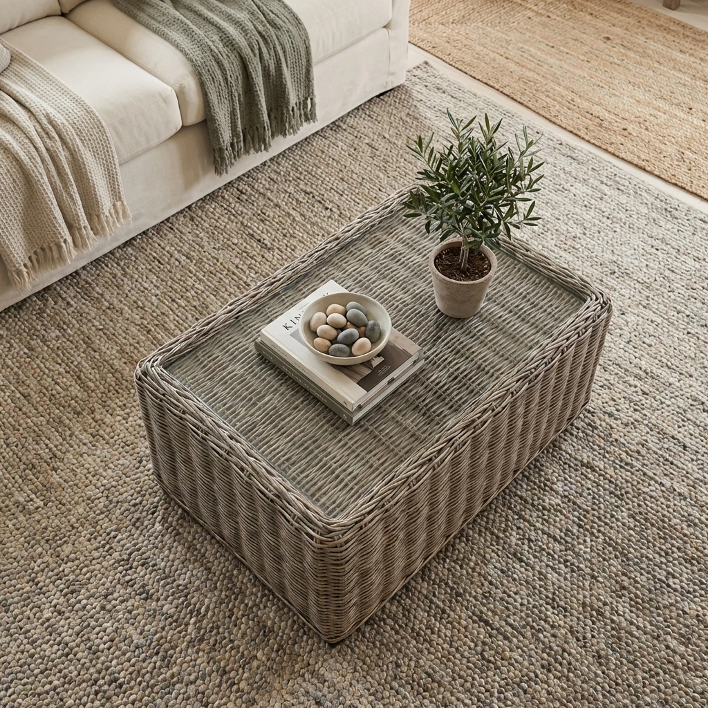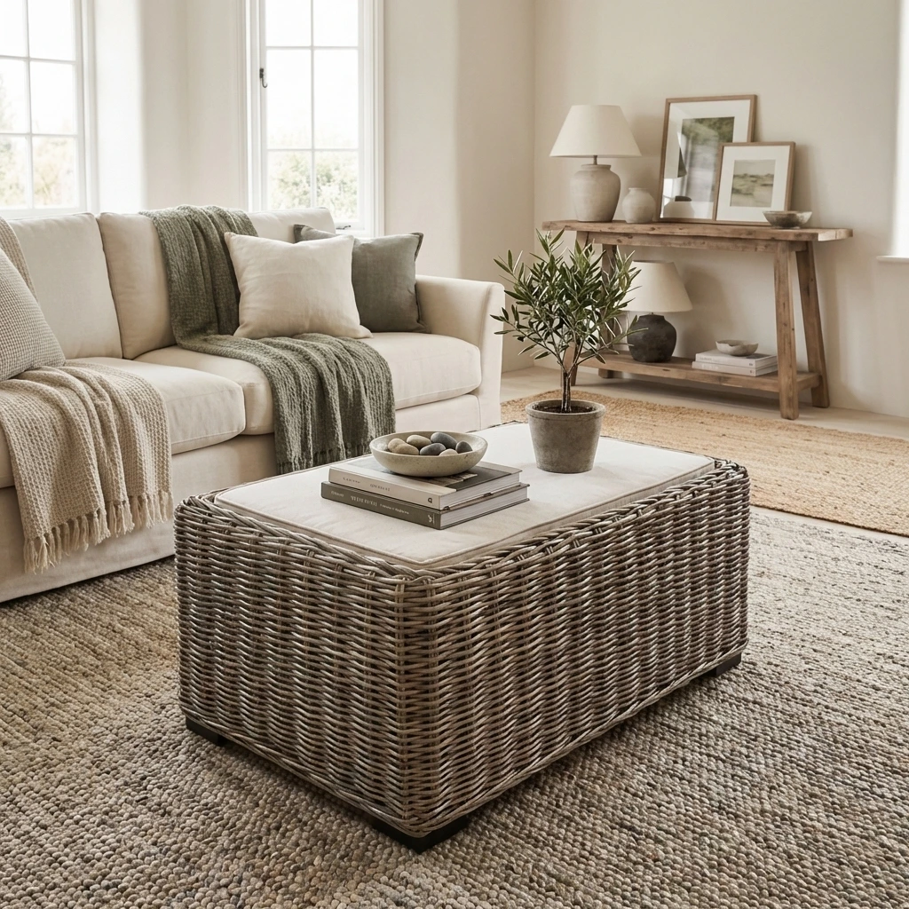 90cm Rectangular Natural Kubu Wicker Indoor/Outdoor Coffee Table or Footstool with Natural Linen Cushion & Glass Top