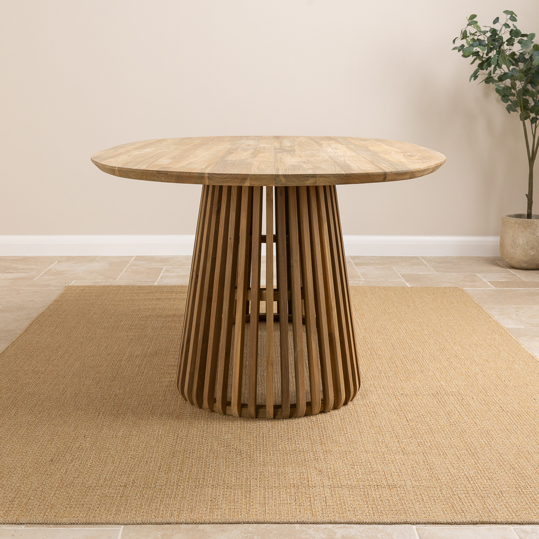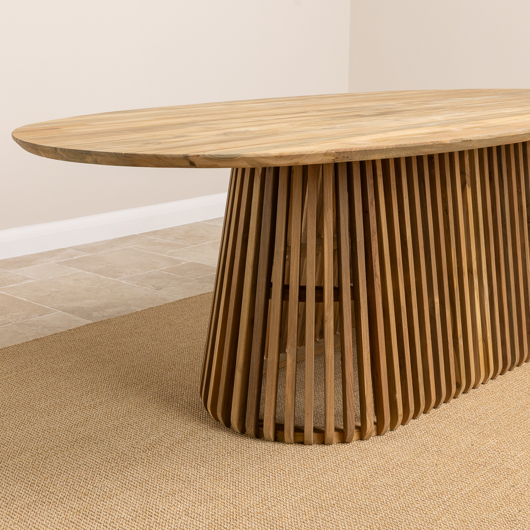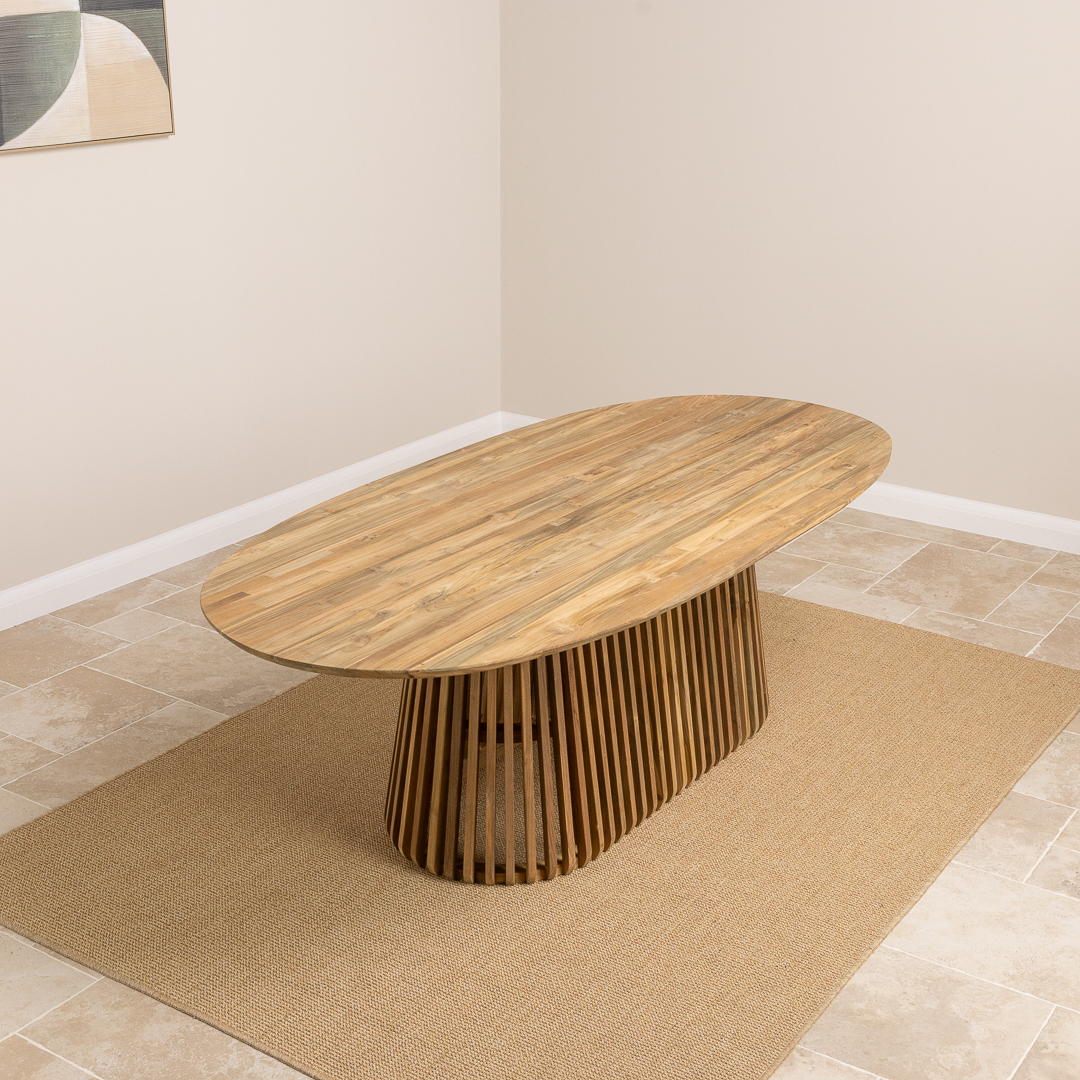 The Eclipse 8 Seater Dining Table offers generous scale and sculptural elegance. Made from sustainably sourced reclaimed teak, the 240cm oval top highlights unique grain and warm earthy tones. Its slatted cylindrical pedestal base introduces a modern architectural twist, bringing dynamic texture and refined presence to any dining room.