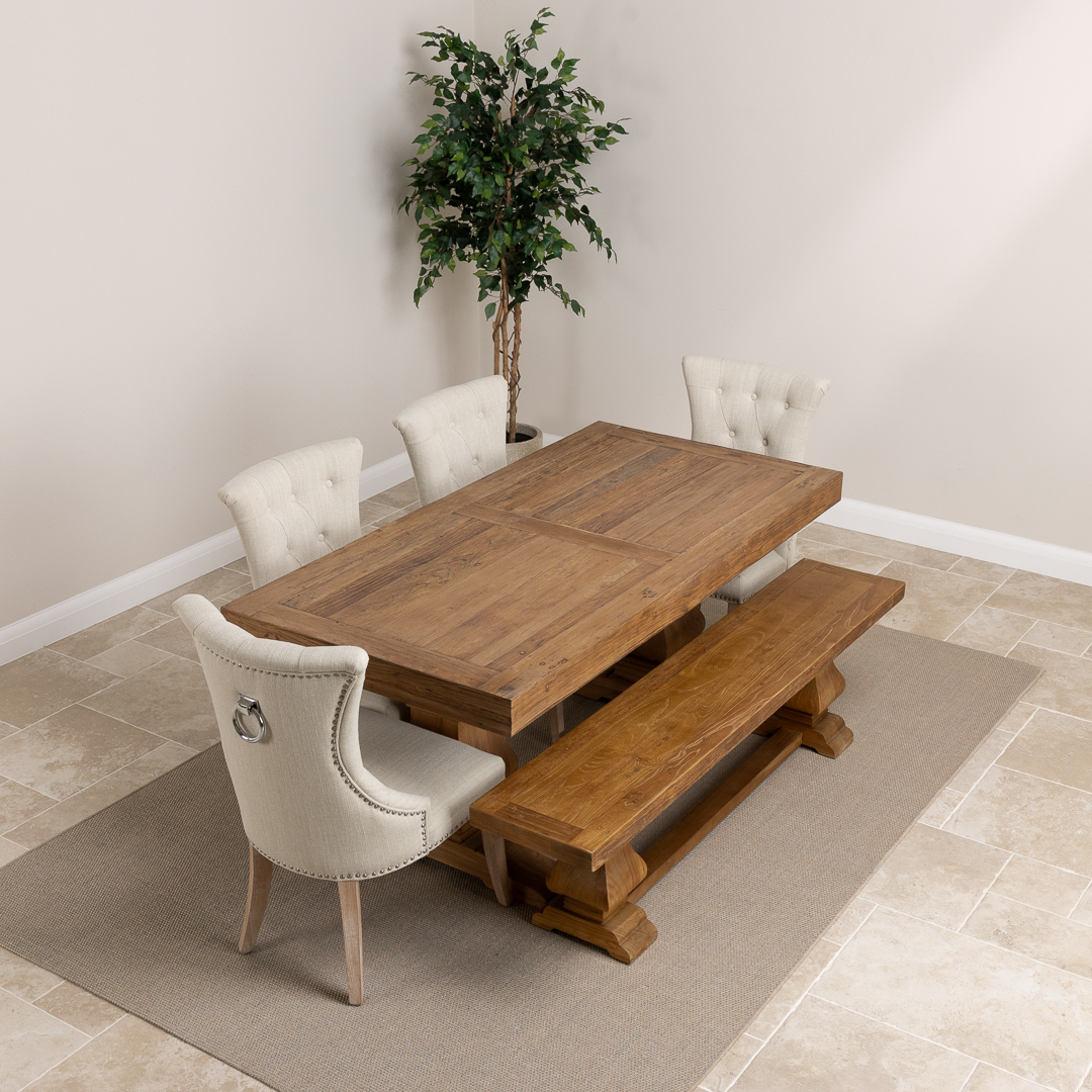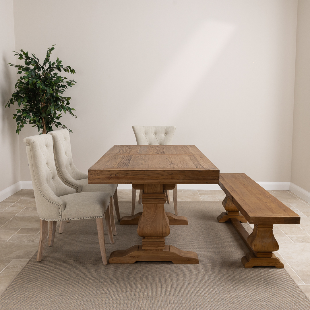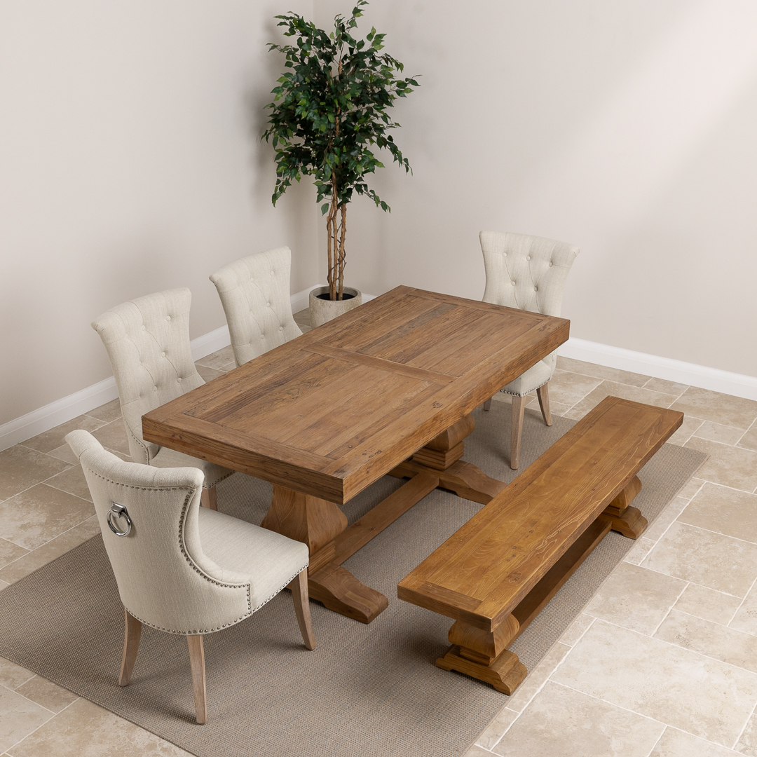 180cm Rectangular Reclaimed Elm Pedestal Indoor Dining Table with Elm Bench & 2 or 4 Upholstered Windsor Chairs