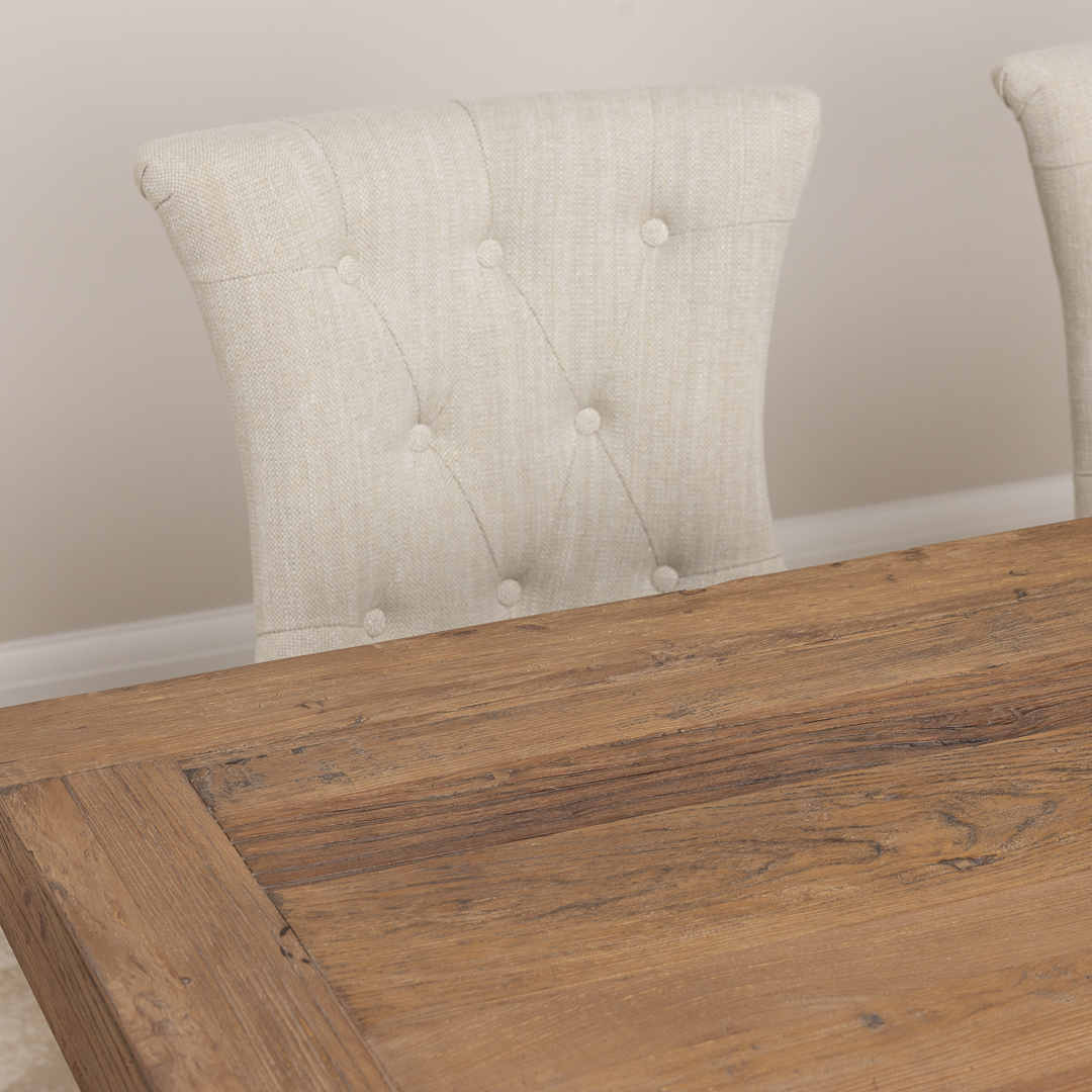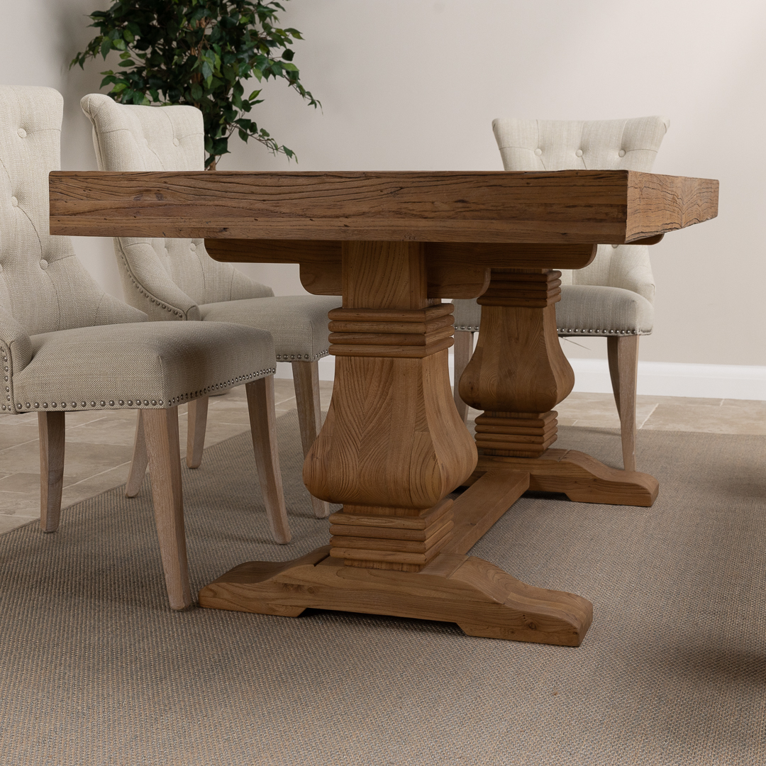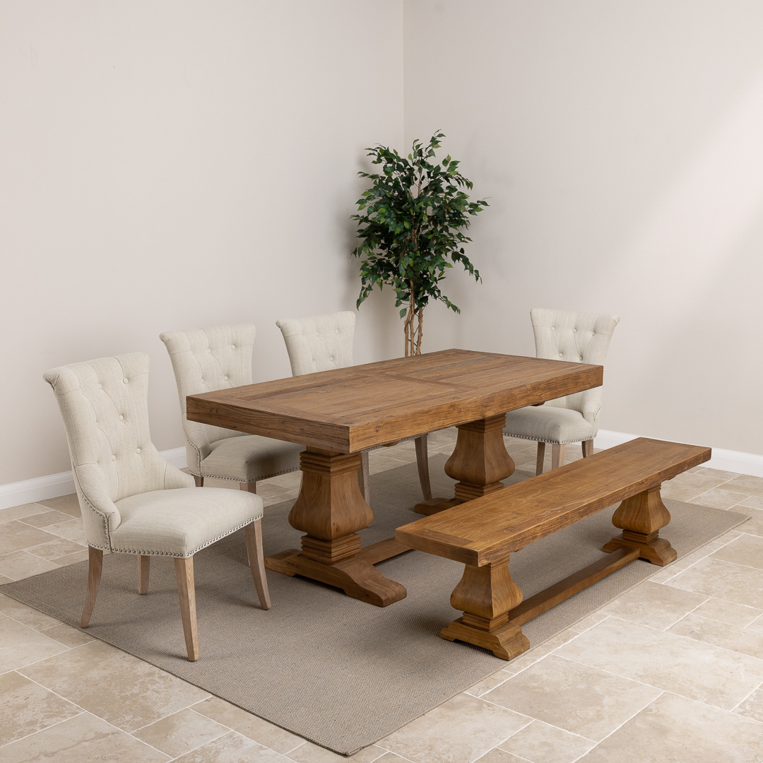 180cm Rectangular Reclaimed Elm Pedestal Indoor Dining Table with Elm Bench & 2 or 4 Upholstered Windsor Chairs