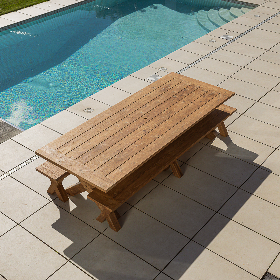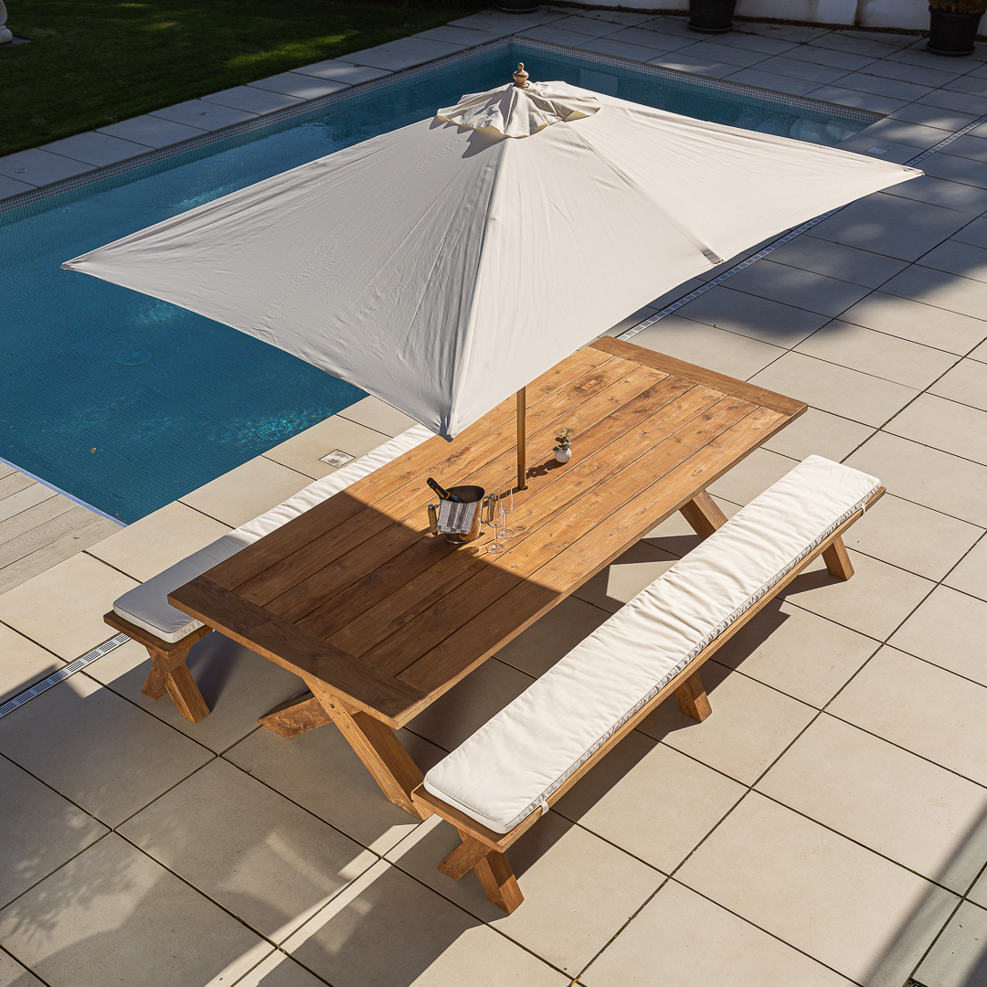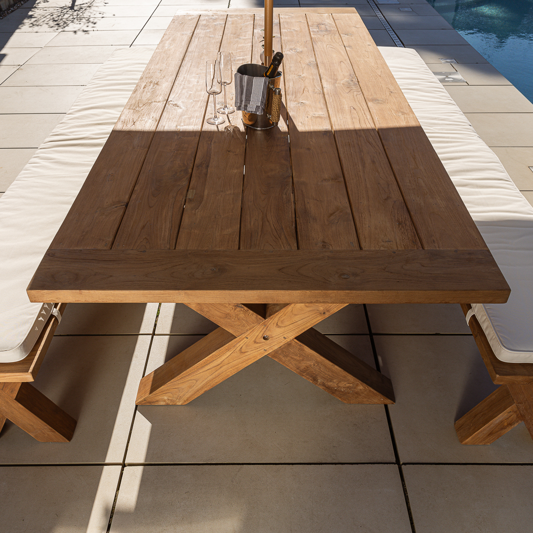 This Eros Dining Set includes a 300cm reclaimed teak cross‑leg table paired with two matching benches for a spacious, cohesive outdoor layout. Crafted from previously used teak, the set offers natural grain, strength, and year‑round durability. Benches are perfect for maximising seating and accommodating extra guests with ease.