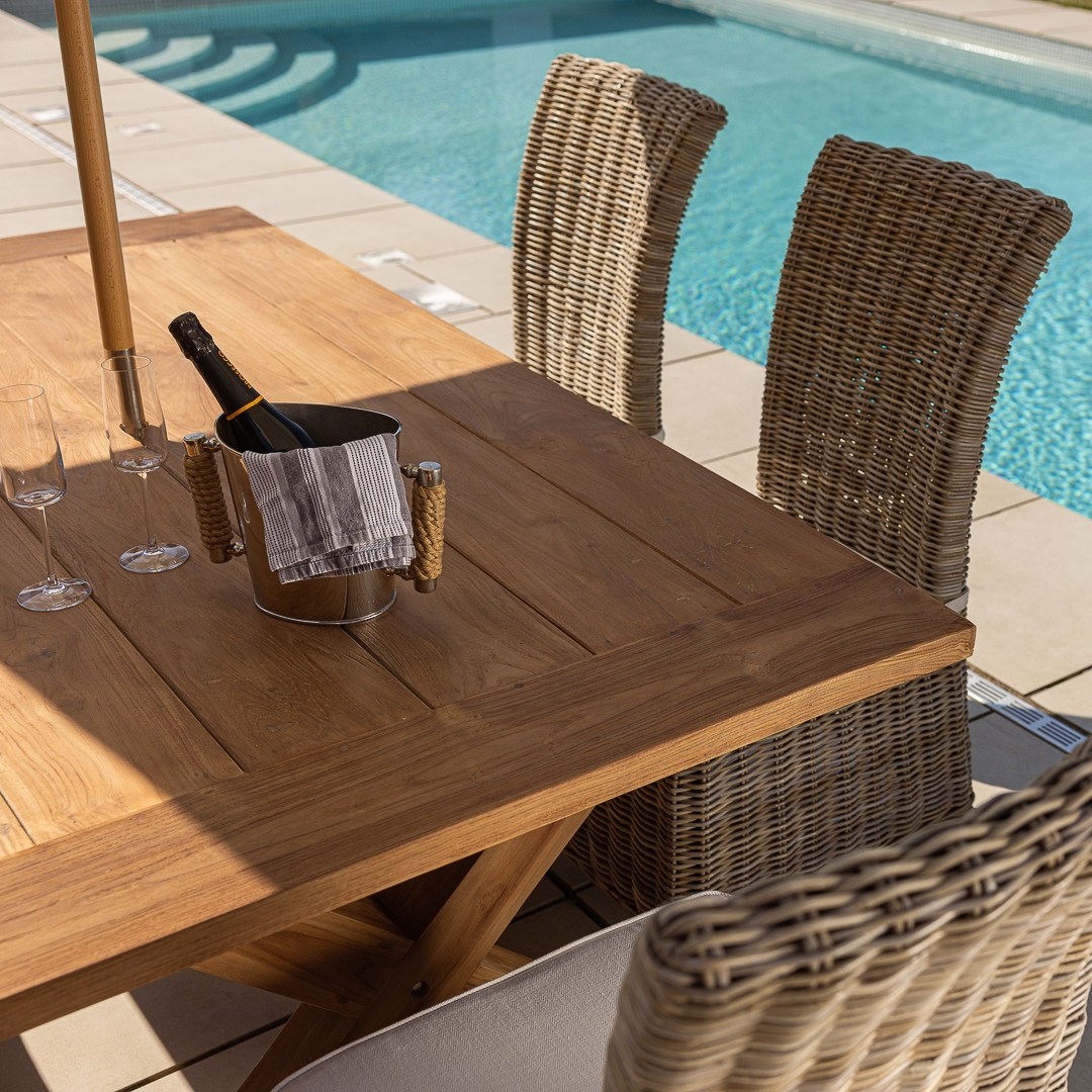 200cm Rectangular Natural Reclaimed Teak Cross Leg Outdoor Dining Table with 4 or 6 Natural Kubu Wicker ChairsIn stock