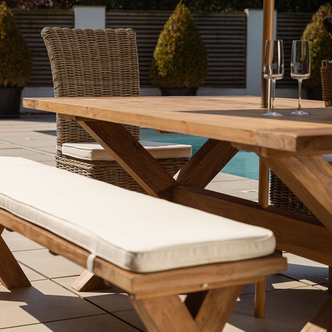 200cm Rectangular Natural Reclaimed Teak Cross Leg Outdoor Dining Table with Bench & 2 or 4 Natural Kubu Wicker Chairs
