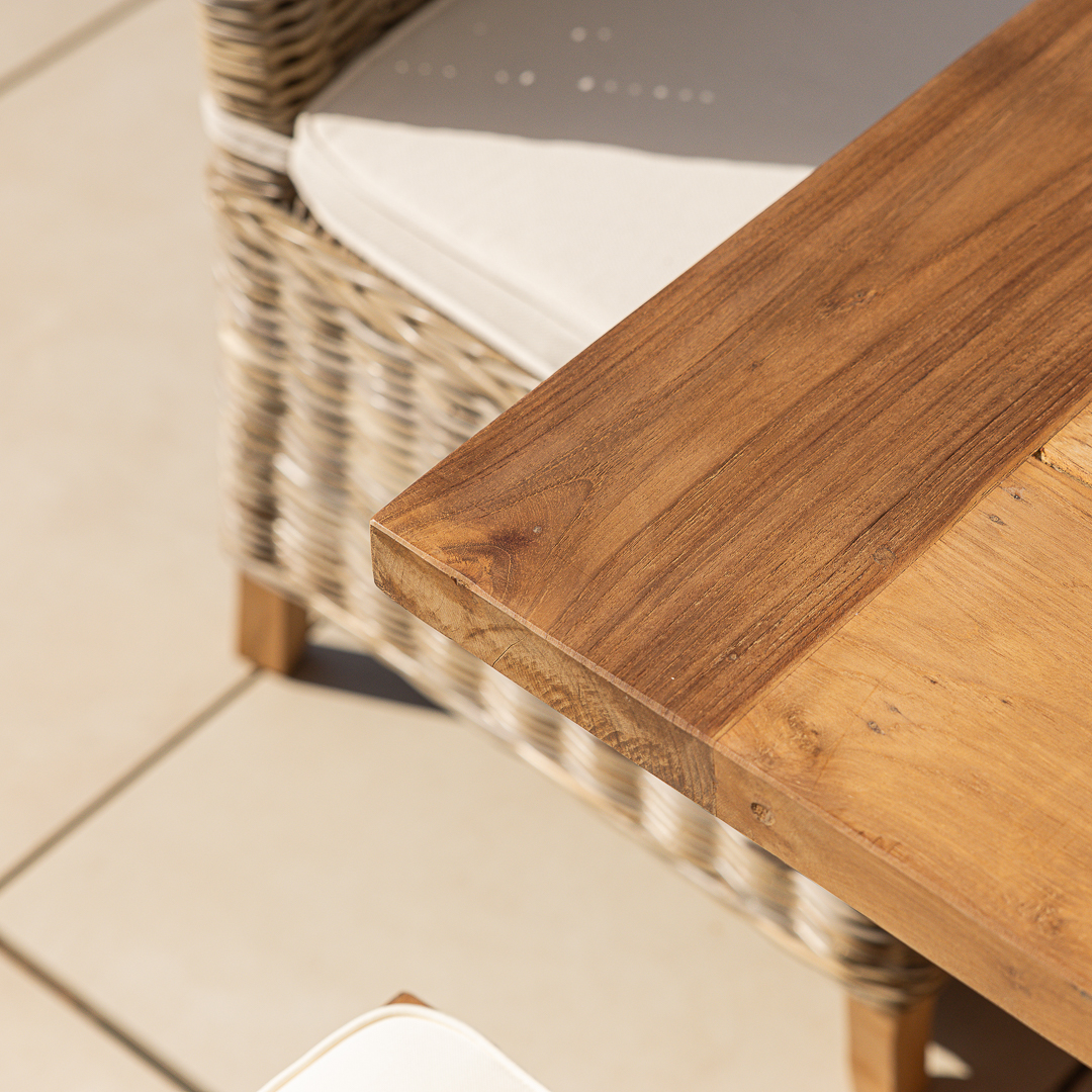 160cm Rectangular Natural Reclaimed Teak Straight Leg Outdoor Dining Table with 4 or 6 Natural Kubu Wicker ChairsIn stock