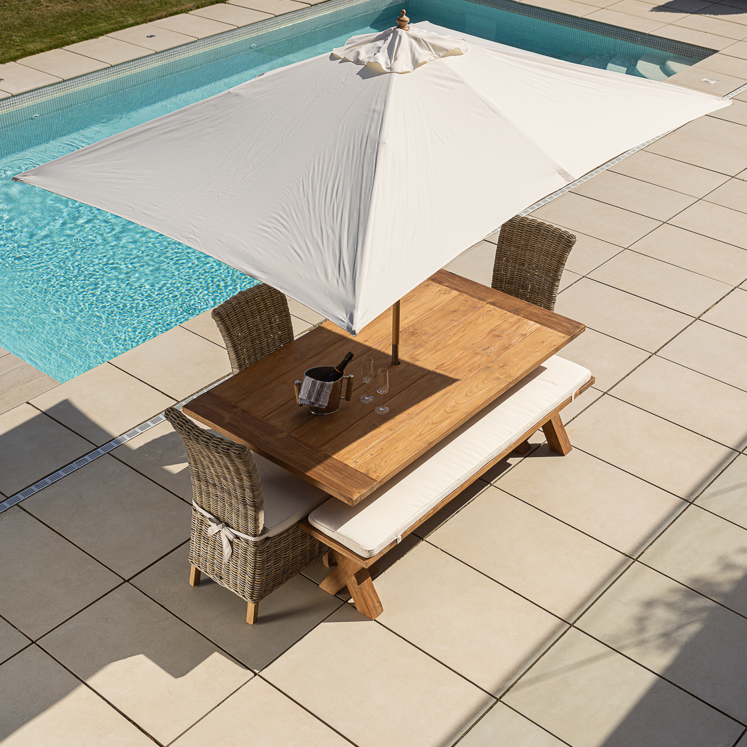 200cm Rectangular Natural Reclaimed Teak Straight Leg Outdoor Dining Table with Bench & 2 or 4 Natural Kubu Wicker ChairsIn stock