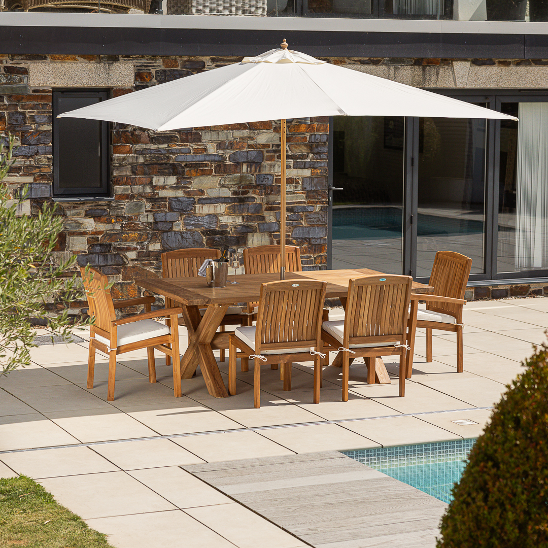 240cm Rectangular Natural Reclaimed Teak Cross Leg Outdoor Dining Table with 6 or 8 Marley Teak Stacking ChairsIn stock