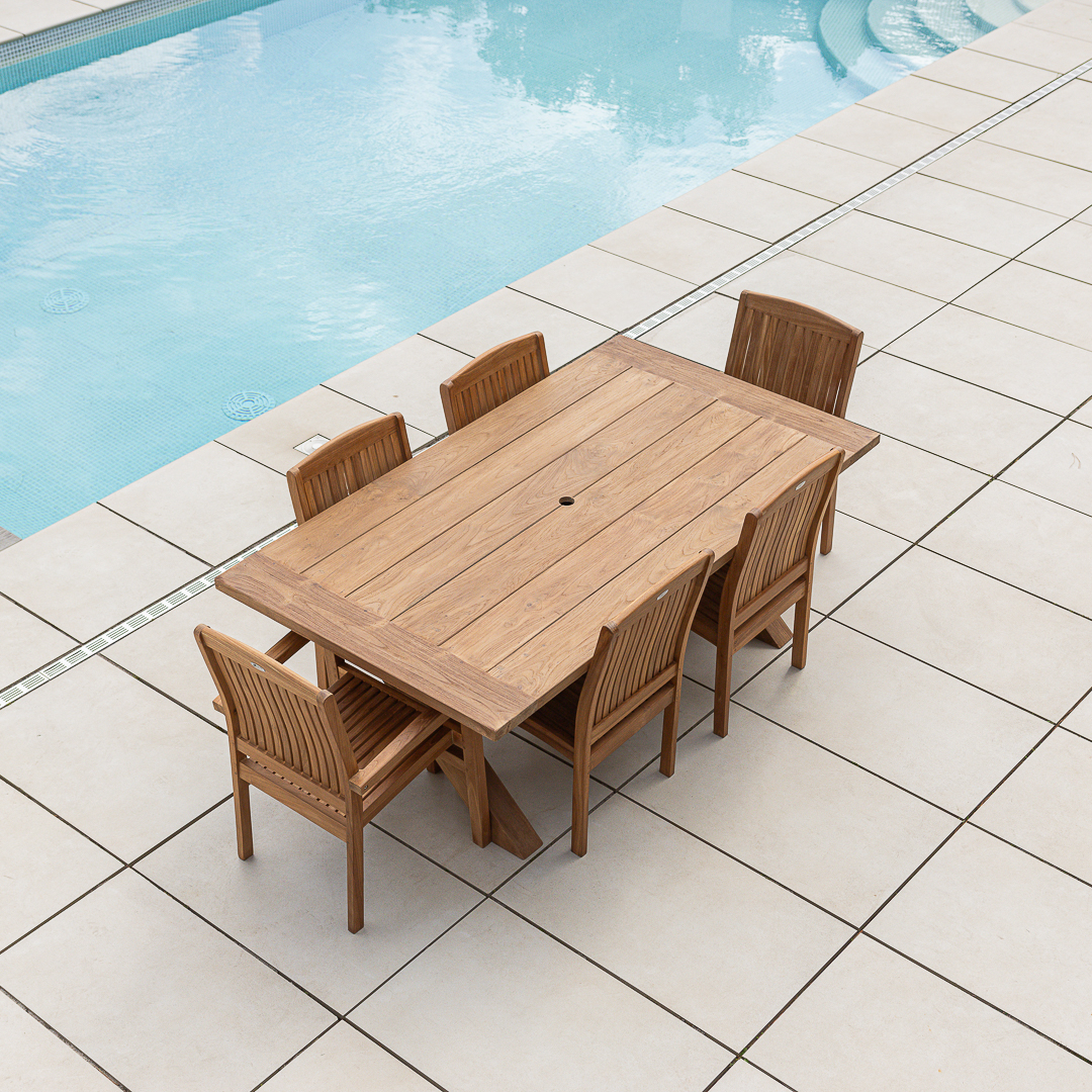 200cm Rectangular Natural Reclaimed Teak Cross Leg Outdoor Dining Table with 4 or 6 Marley Teak Stacking Chairs