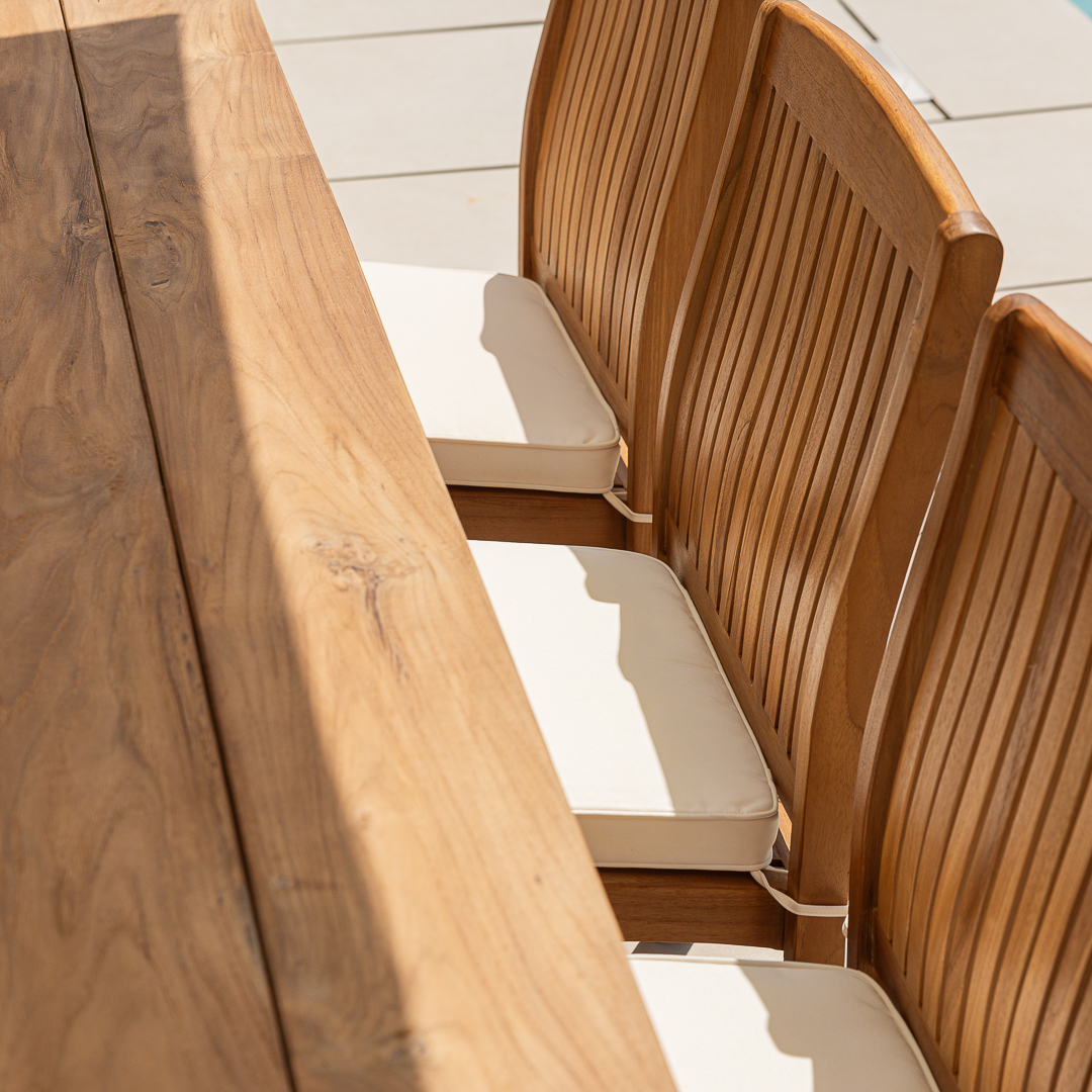 300cm Rectangular Natural Reclaimed Teak Straight Leg Outdoor Dining Table with Bench & 4 or 6 Marley Teak Stacking ChairsIn stock