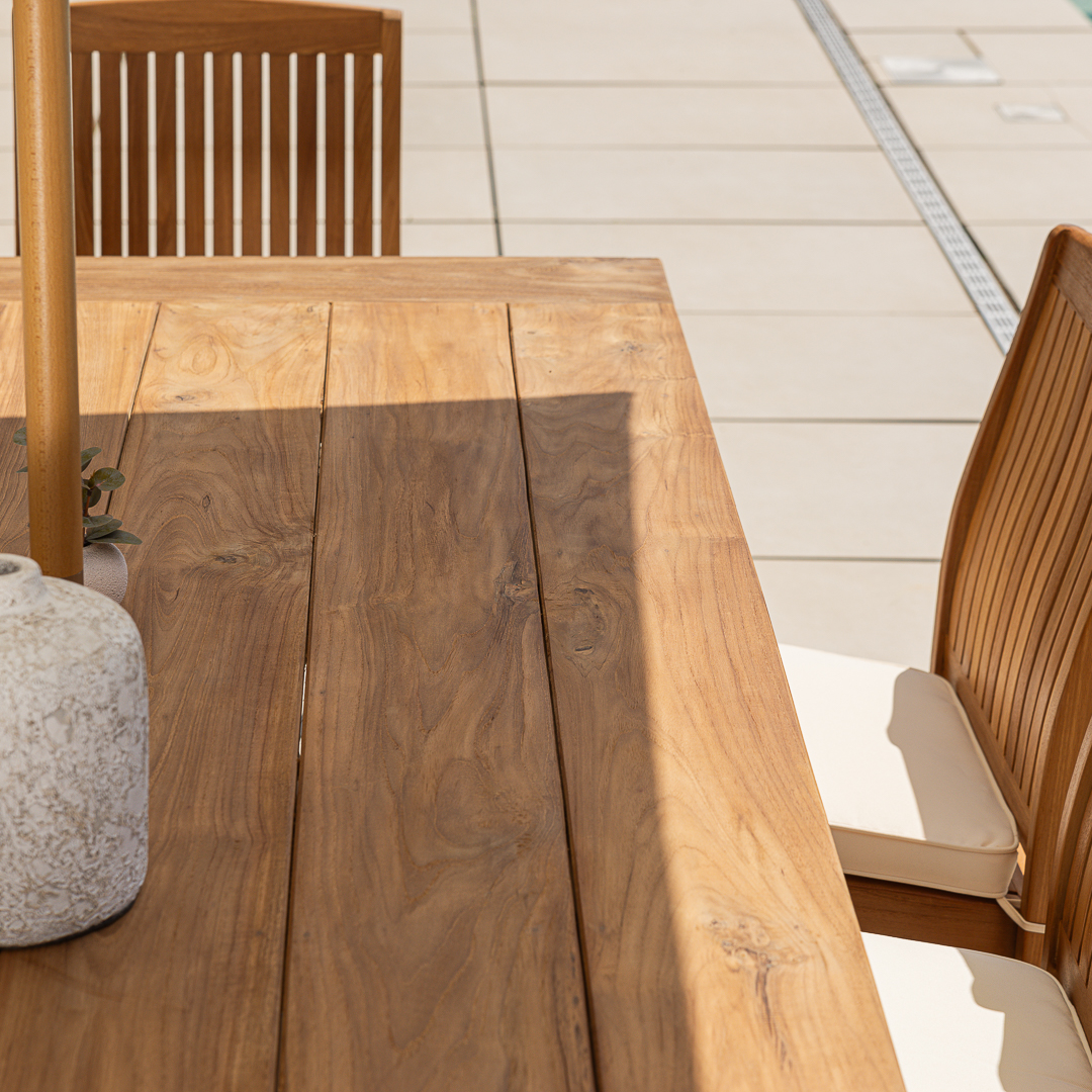 200cm Rectangular Natural Reclaimed Teak Straight Leg Outdoor Dining Table with 4 or 6 Marley Teak Stacking ChairsIn stock