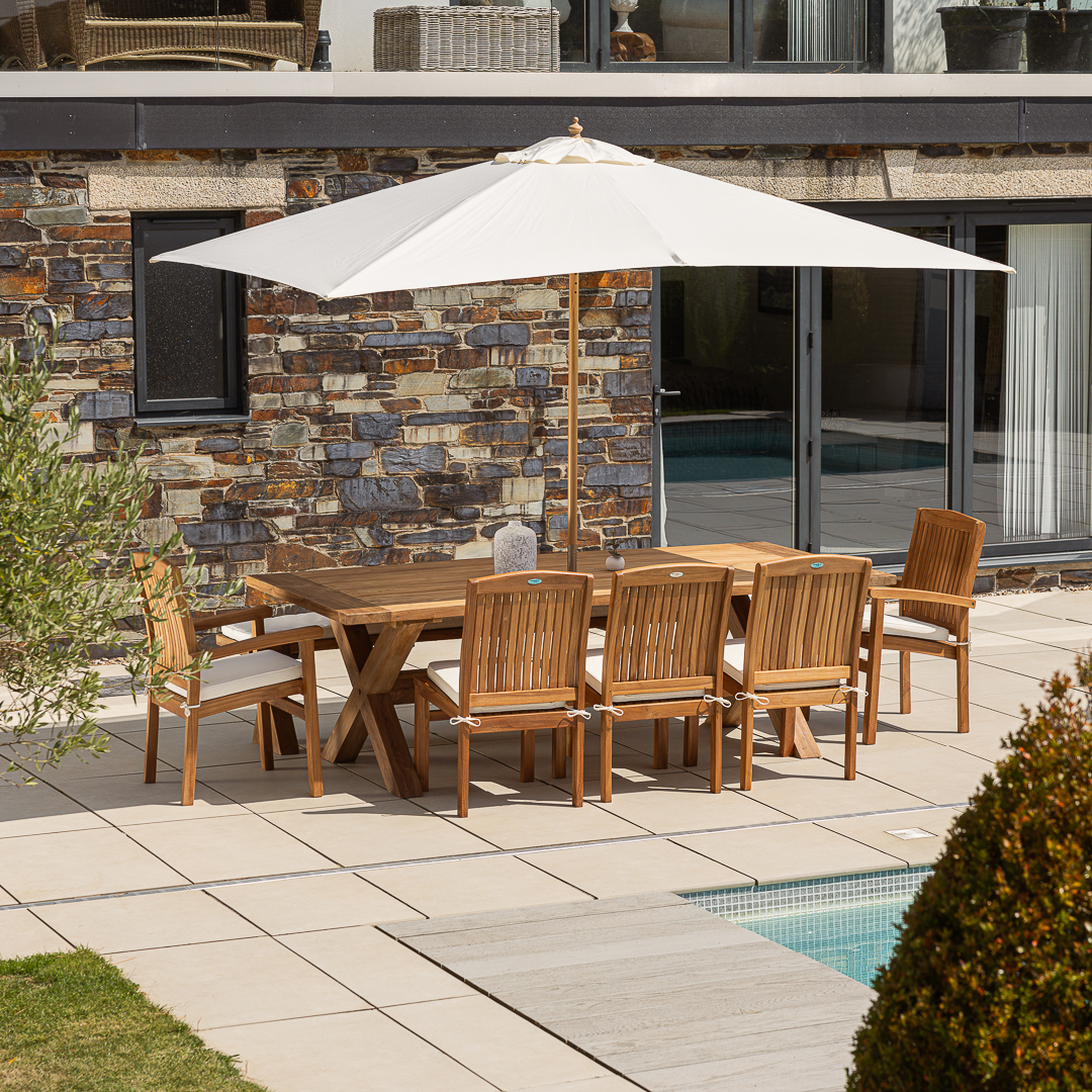 240cm Rectangular Natural Reclaimed Teak Cross Leg Outdoor Dining Table with 6 or 8 Marley Teak Stacking ChairsIn stock