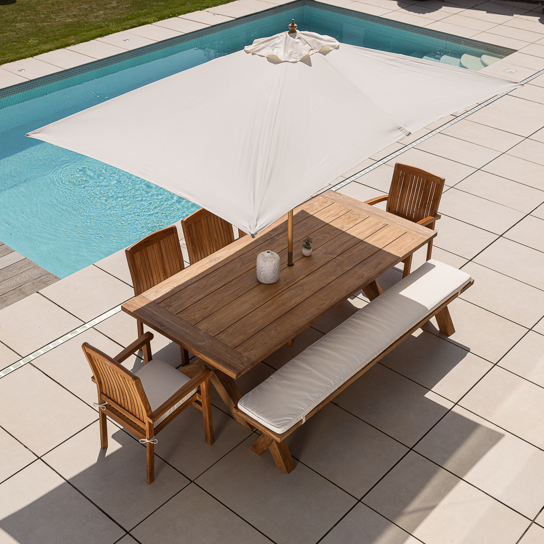 240cm Rectangular Natural Reclaimed Teak Cross Leg Outdoor Dining Table with Bench & 3 or 5 Scandi ArmchairsIn stock