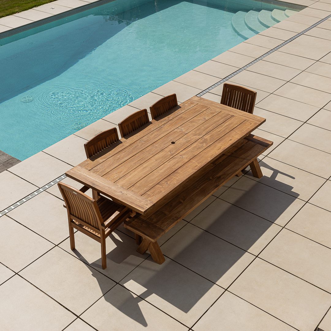 300cm Rectangular Natural Reclaimed Teak Cross Leg Outdoor Dining Table with Bench & 4 or 6 Marley Teak Stacking ChairsIn stock
