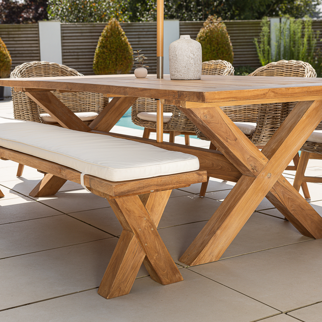 240cm Rectangular Natural Reclaimed Teak Cross Leg Outdoor Dining Table with Bench & 3 or 5 Natural Kubu Wicker ChairsIn stock