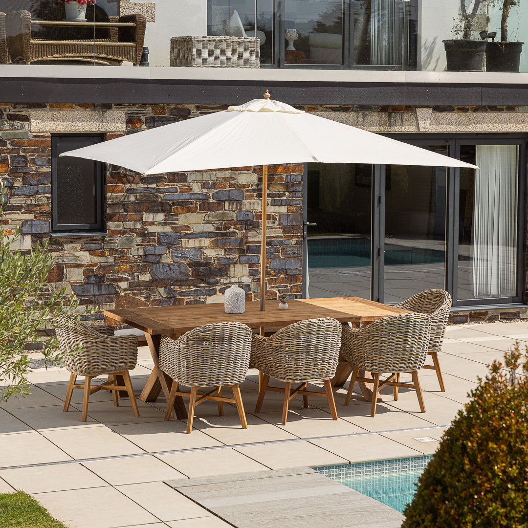 240cm Rectangular Natural Reclaimed Teak Cross Leg Outdoor Dining Table with 6 or 8 Natural Kubu Wicker ChairsIn stock