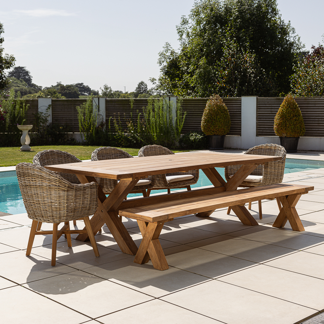 300cm Rectangular Natural Reclaimed Teak Cross Leg Outdoor Dining Table with Bench & 4 or 6 Natural Kubu Wicker ChairsIn stock