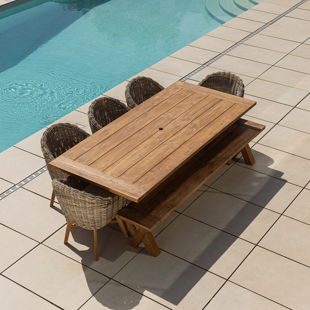 240cm Rectangular Natural Reclaimed Teak Straight Leg Outdoor Dining Table with Bench & 3 or 5 Natural Kubu Wicker ChairsIn stock