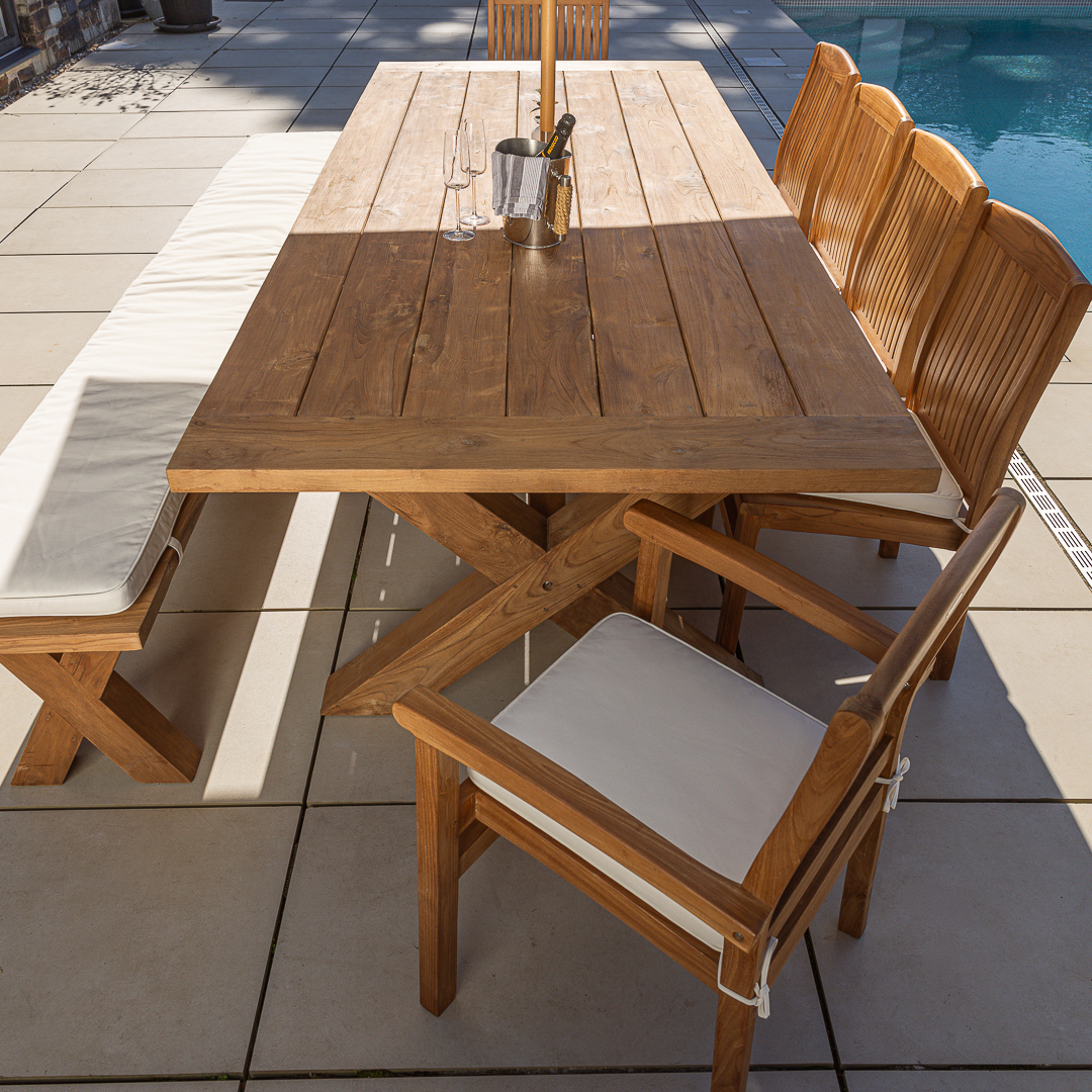240cm Rectangular Natural Reclaimed Teak Cross Leg Outdoor Dining Table with Bench & 3 or 5 Scandi ArmchairsIn stock