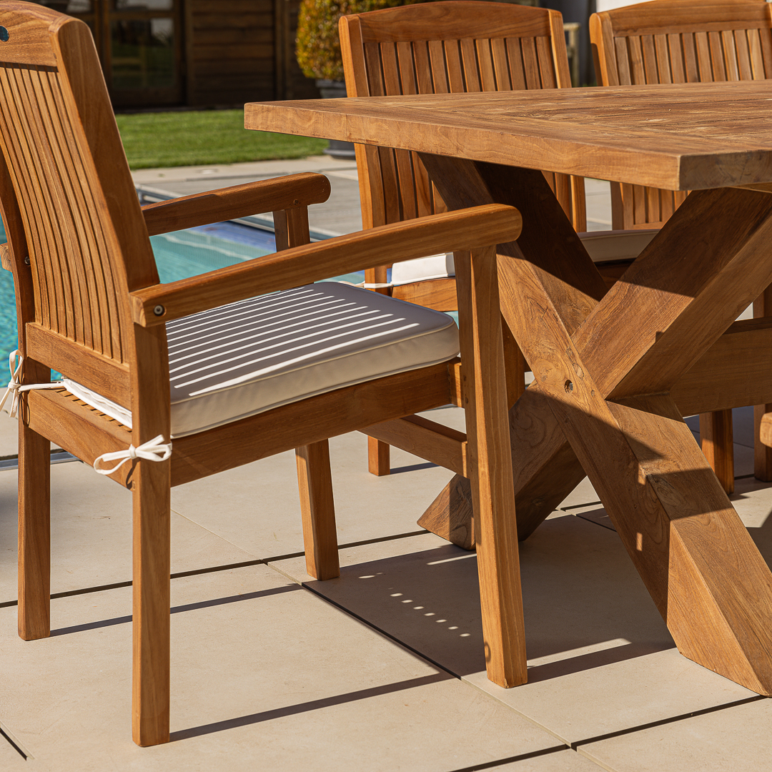 240cm Rectangular Natural Reclaimed Teak Cross Leg Outdoor Dining Table with 6 or 8 Scandi ArmchairsIn stock