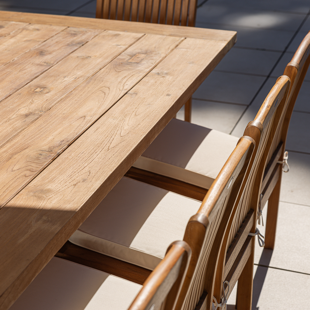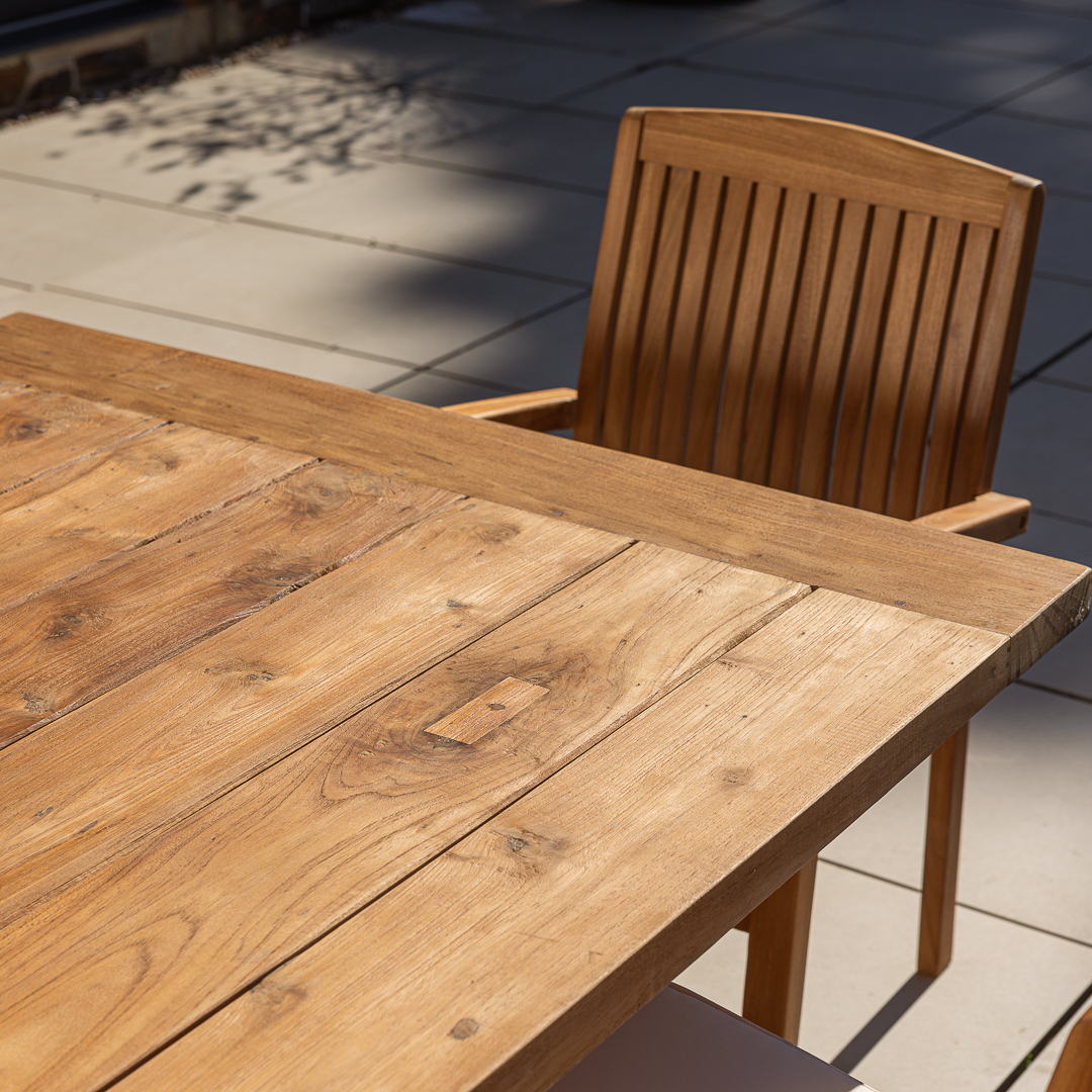 200cm Rectangular Natural Reclaimed Teak Straight Leg Outdoor Dining Table with 4 or 6 Marley Teak Stacking ChairsIn stock