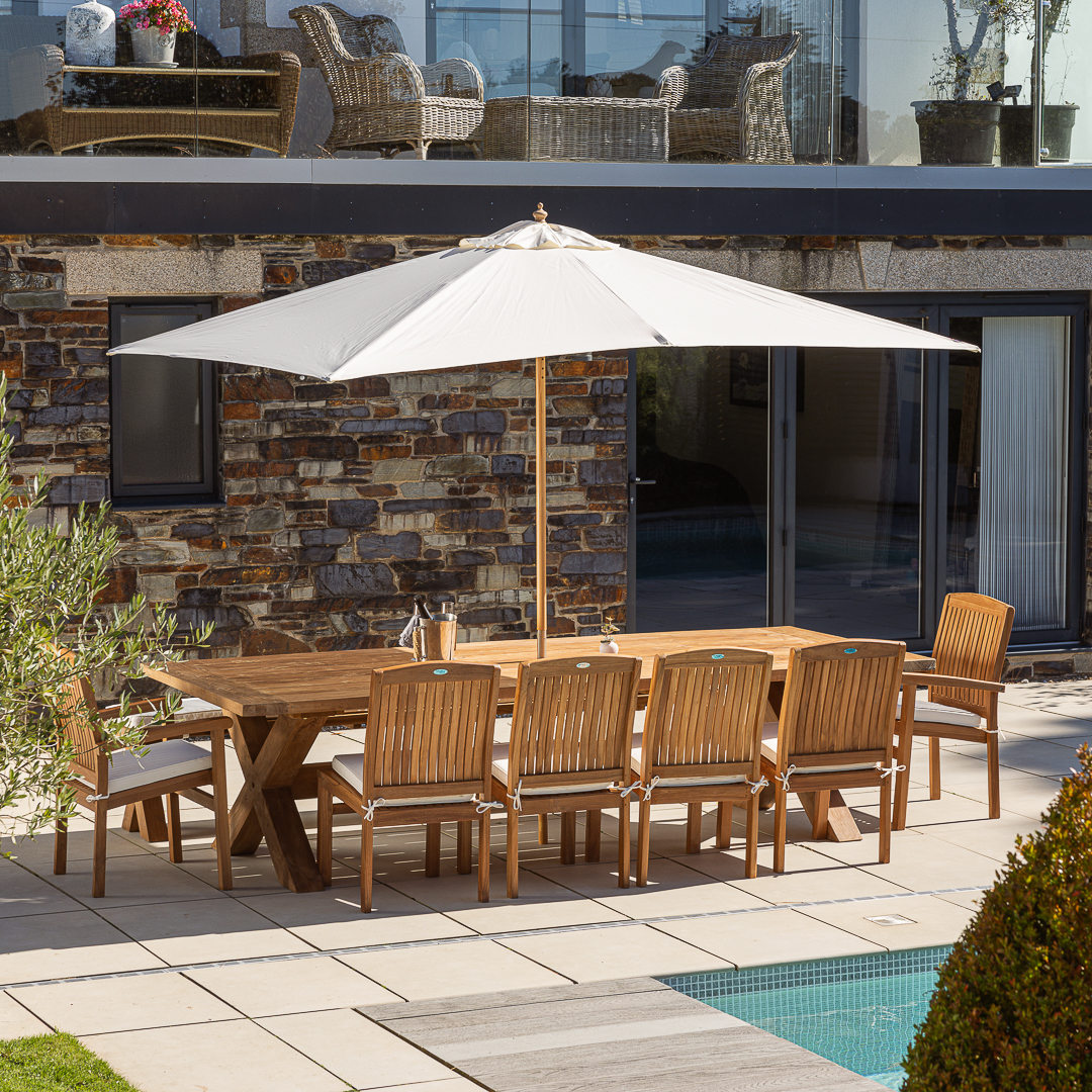 300cm Rectangular Natural Reclaimed Teak Cross Leg Outdoor Dining Table with 8 or 10 Scandi ArmchairsIn stock