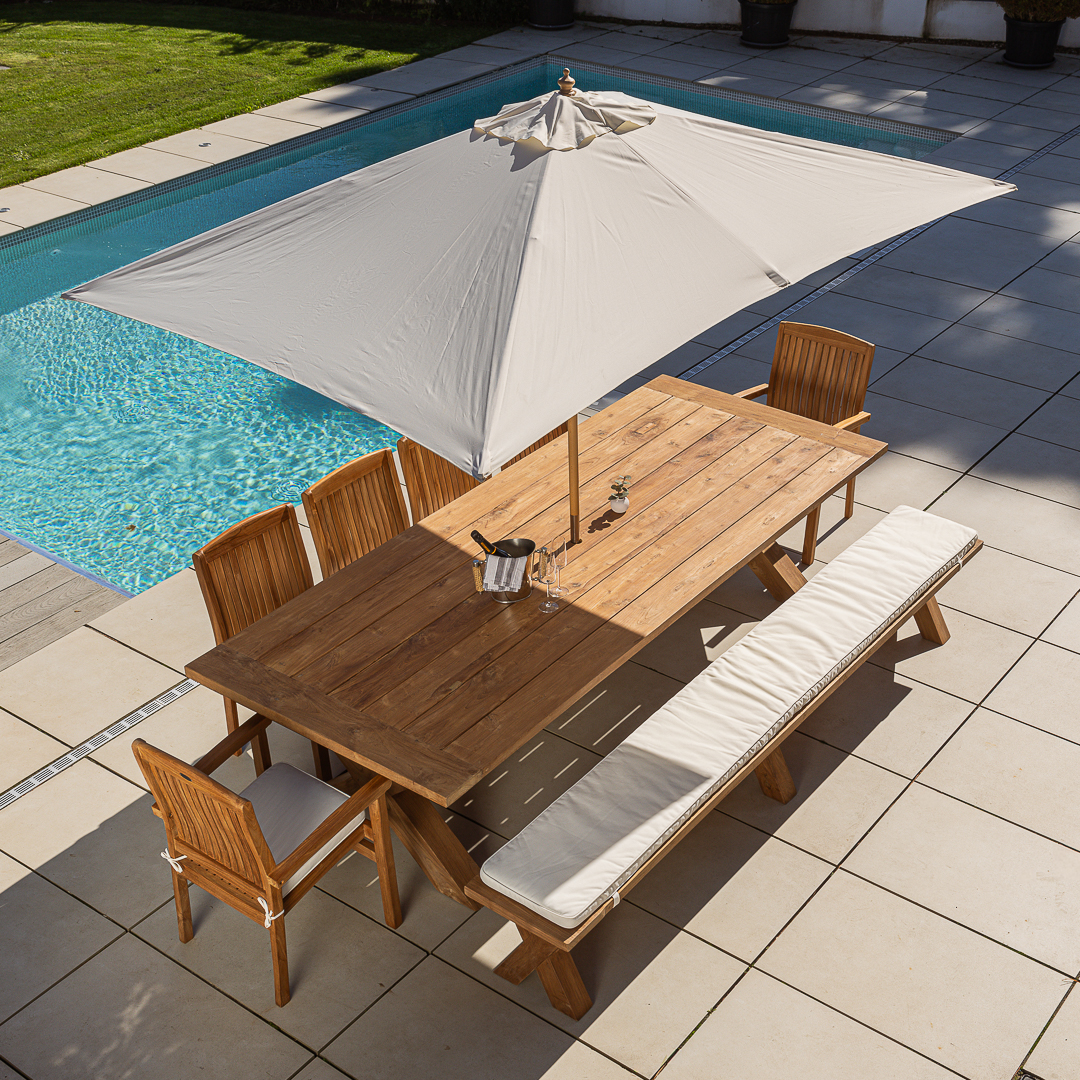 240cm Rectangular Natural Reclaimed Teak Cross Leg Outdoor Dining Table with Bench & 3 or 5 Marley Teak Stacking ChairsIn stock