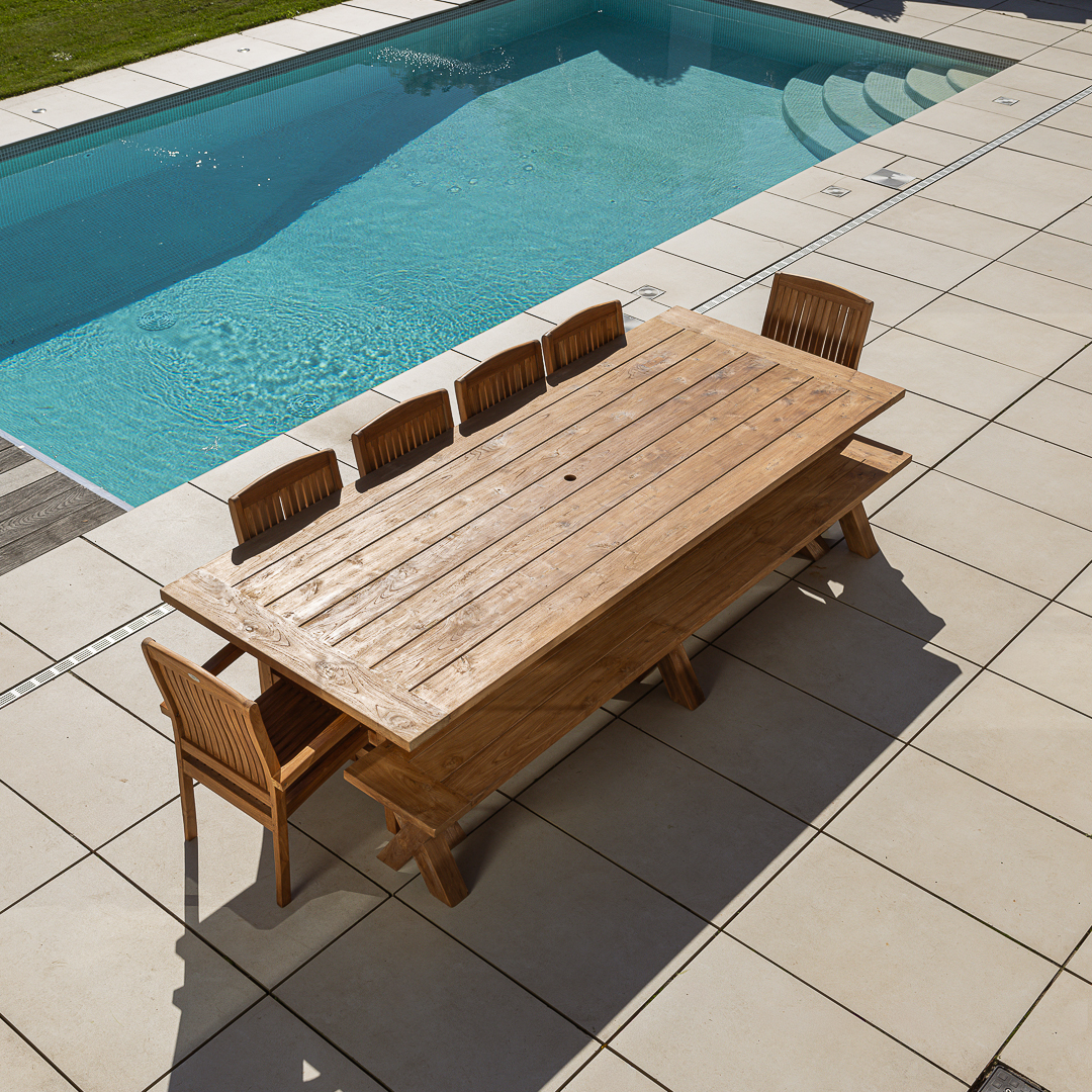 300cm Rectangular Natural Reclaimed Teak Straight Leg Outdoor Dining Table with Bench & 4 or 6 Marley Teak Stacking ChairsIn stock