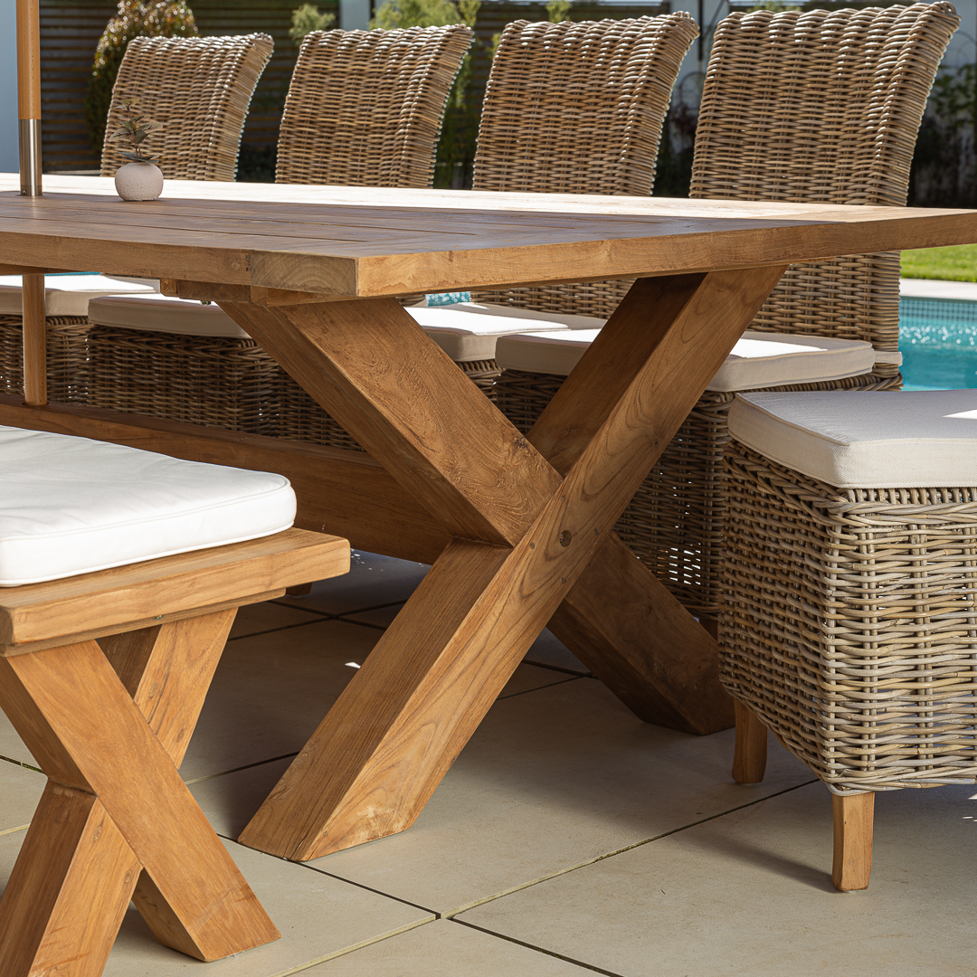 300cm Rectangular Natural Reclaimed Teak Cross Leg Outdoor Dining Table with Bench & 4 or 6 Natural Kubu Wicker Chairs