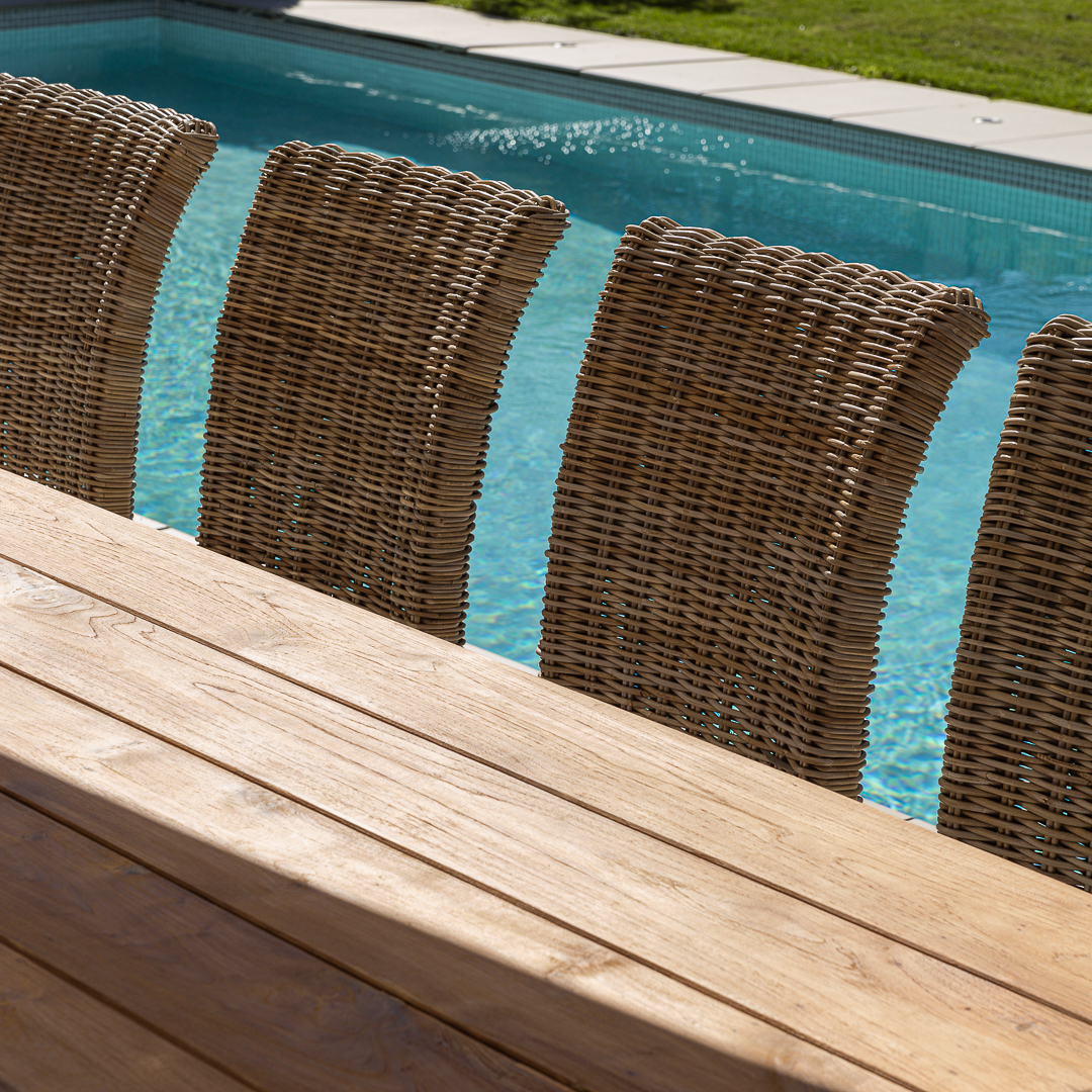 240cm Rectangular Natural Reclaimed Teak Straight Leg Outdoor Dining Table with 6 or 8 Natural Kubu Wicker ChairsIn stock