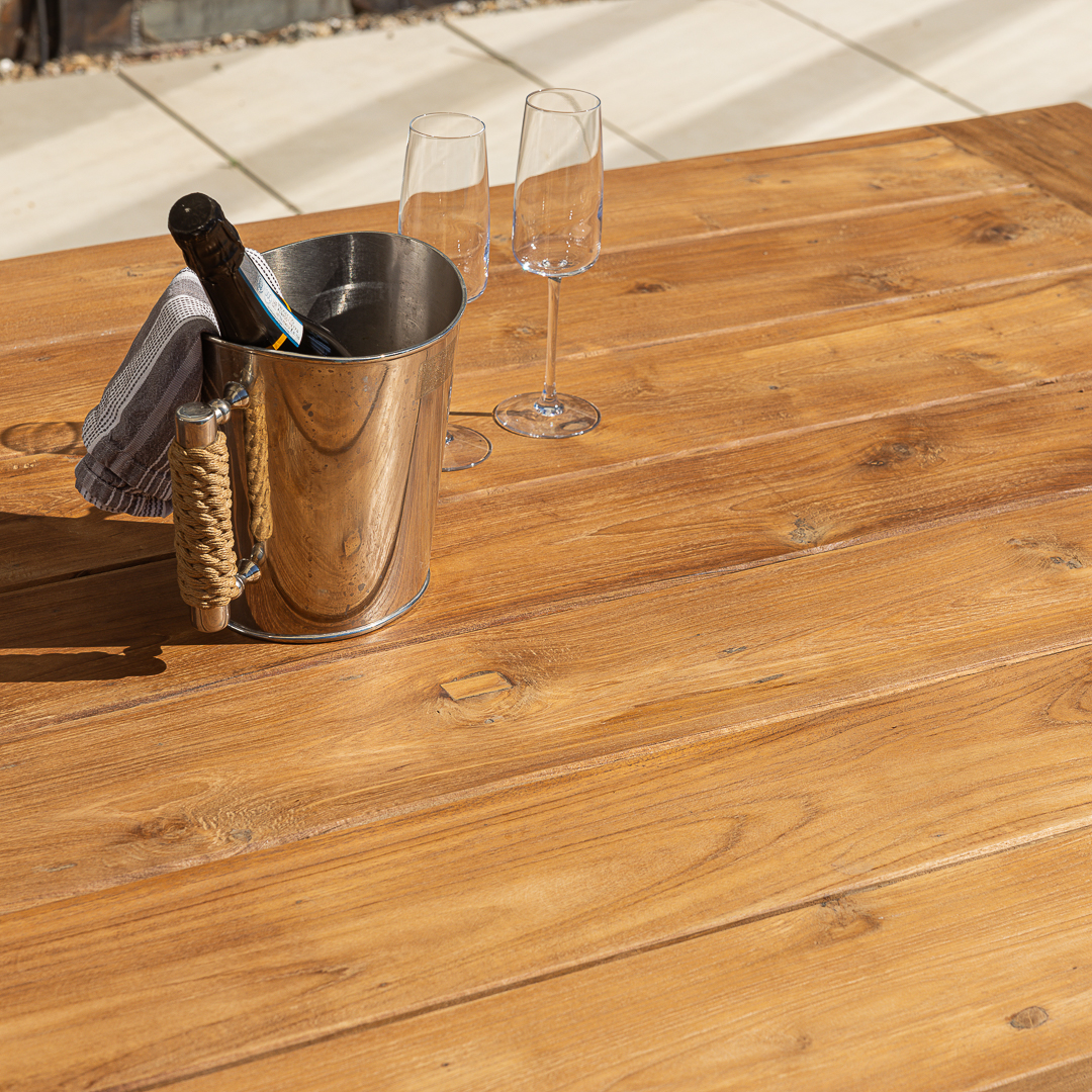200cm Rectangular Natural Reclaimed Teak Straight Leg Outdoor Dining Table with 4 or 6 Marley Teak Stacking ChairsIn stock