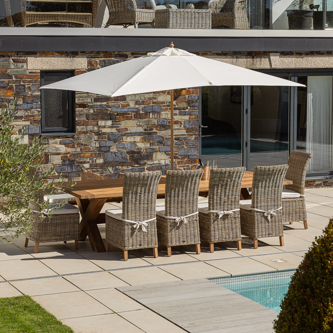 300cm Rectangular Natural Reclaimed Teak Cross Leg Outdoor Dining Table with 8 or 10 Natural Kubu Wicker ChairsIn stock