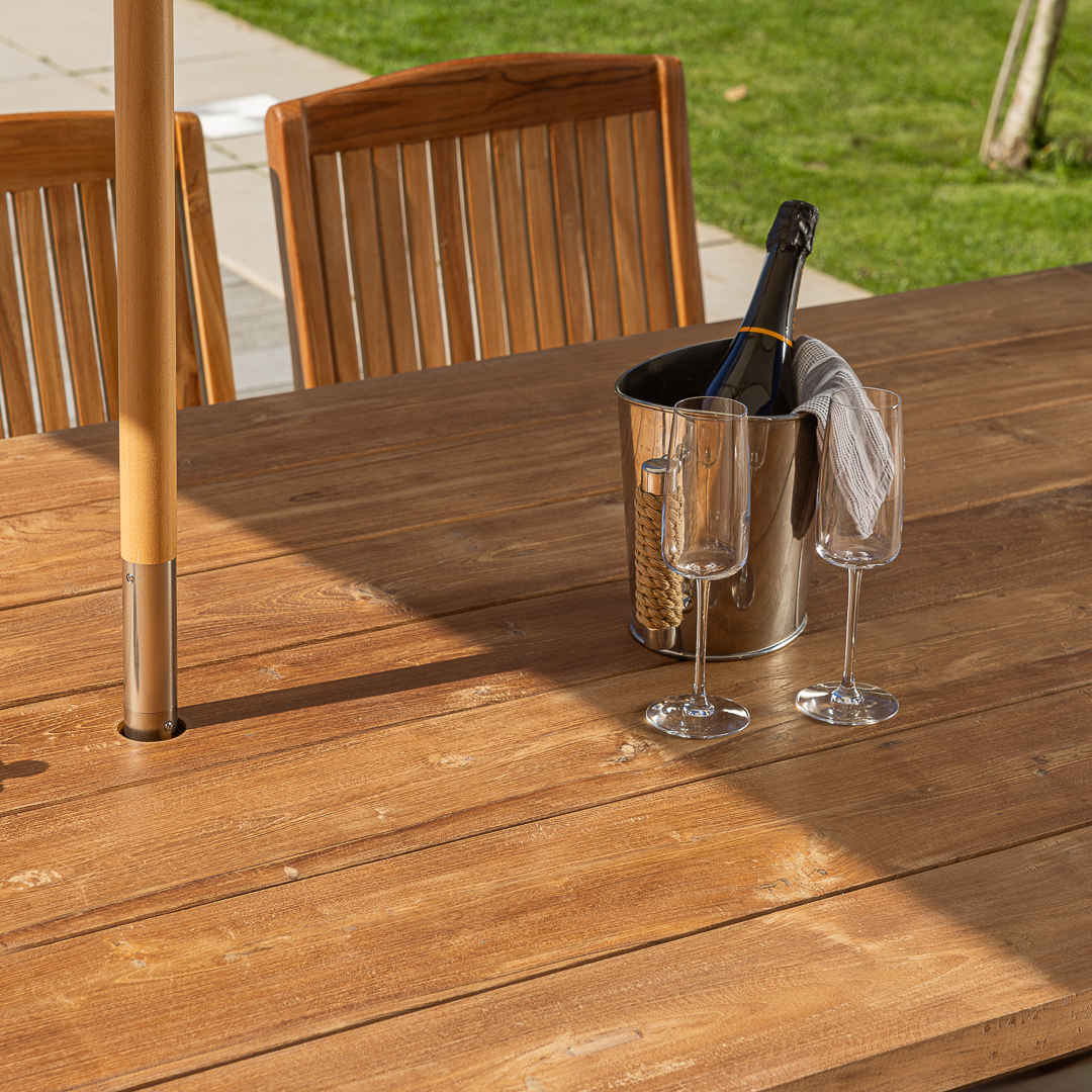 240cm Rectangular Natural Reclaimed Teak Straight Leg Outdoor Dining Table with 6 or 8 Marley Teak Stacking ChairsIn stock