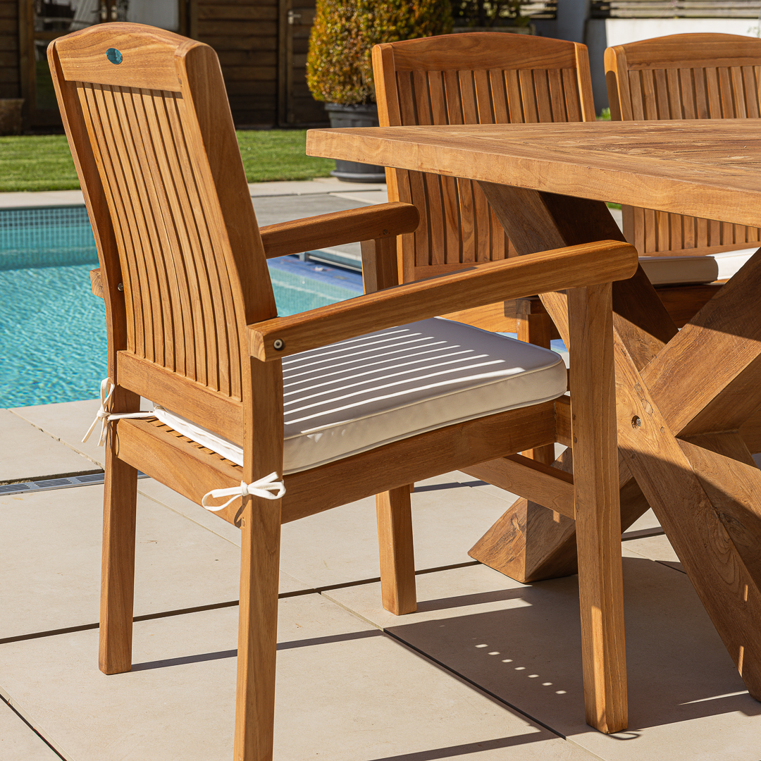 240cm Rectangular Natural Reclaimed Teak Cross Leg Outdoor Dining Table with 6 or 8 Marley Teak Stacking ChairsIn stock
