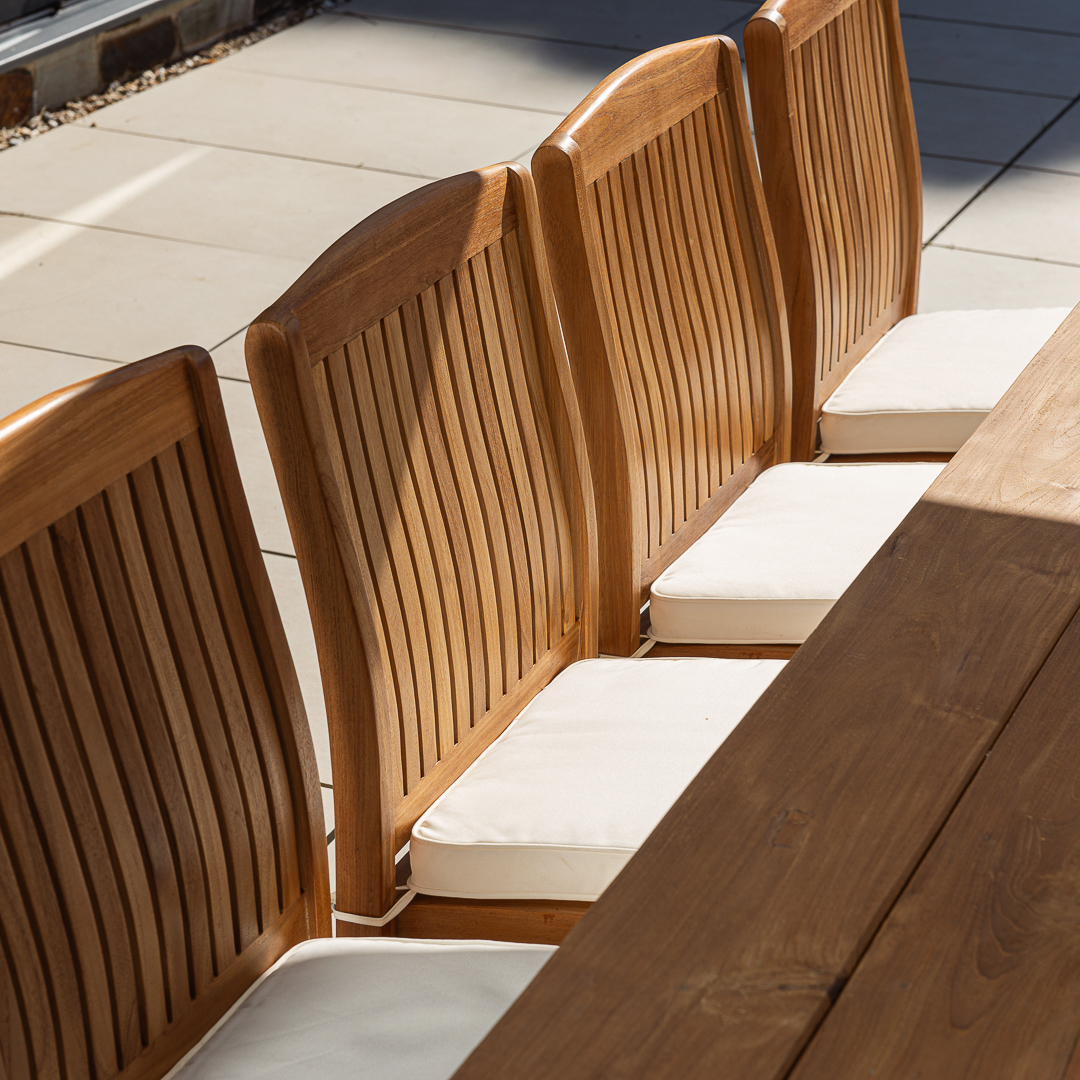 300cm Rectangular Natural Reclaimed Teak Straight Leg Outdoor Dining Table with 8 or 10 Marley Teak Stacking ChairsIn stock