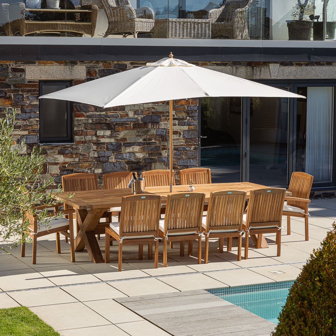 300cm Rectangular Natural Reclaimed Teak Cross Leg Outdoor Dining Table with 8 or 10 Scandi ArmchairsIn stock