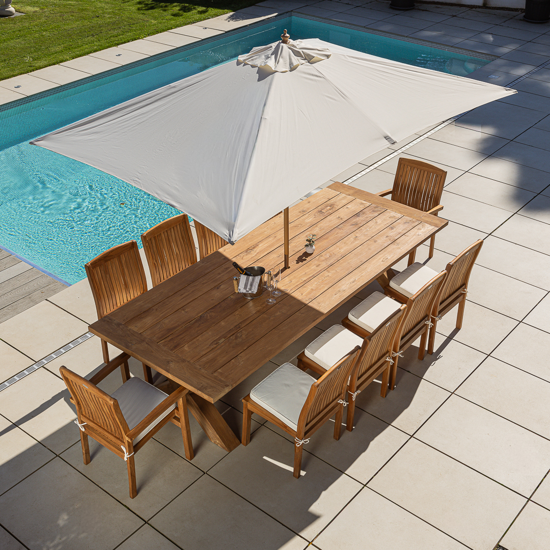 300cm Rectangular Natural Reclaimed Teak Cross Leg Outdoor Dining Table with 8 or 10 Marley Teak Stacking Chairs