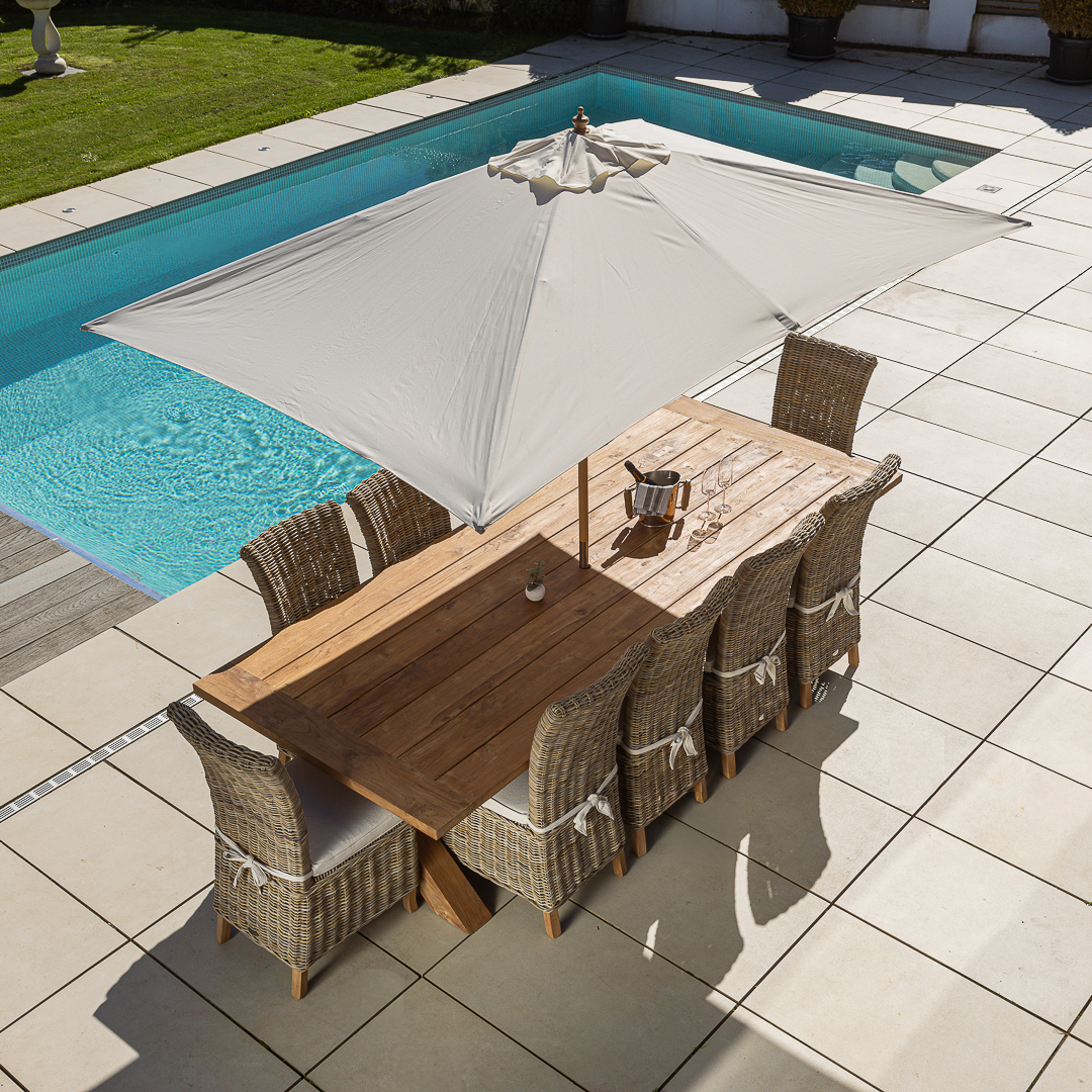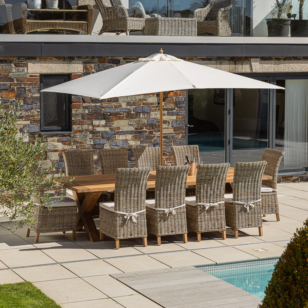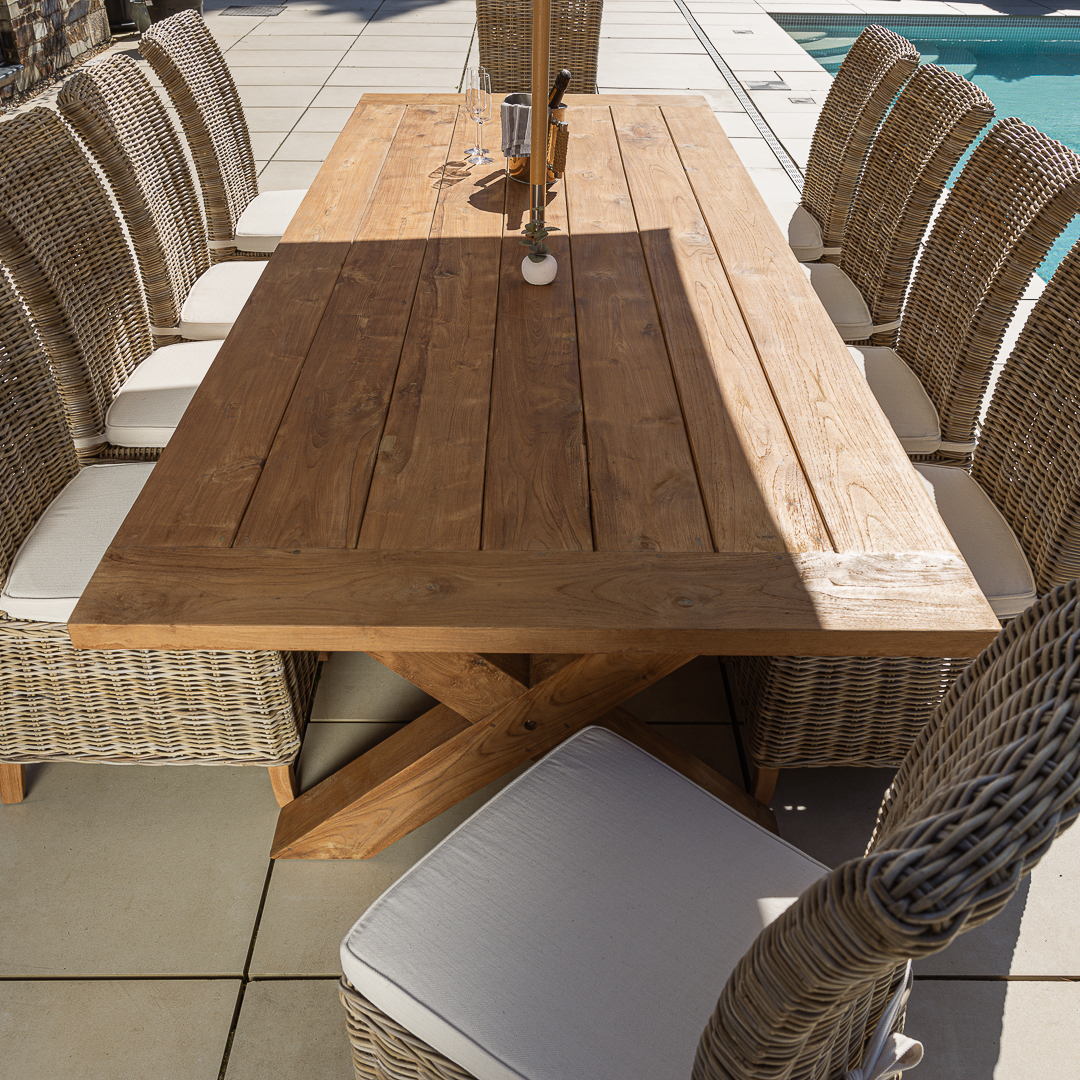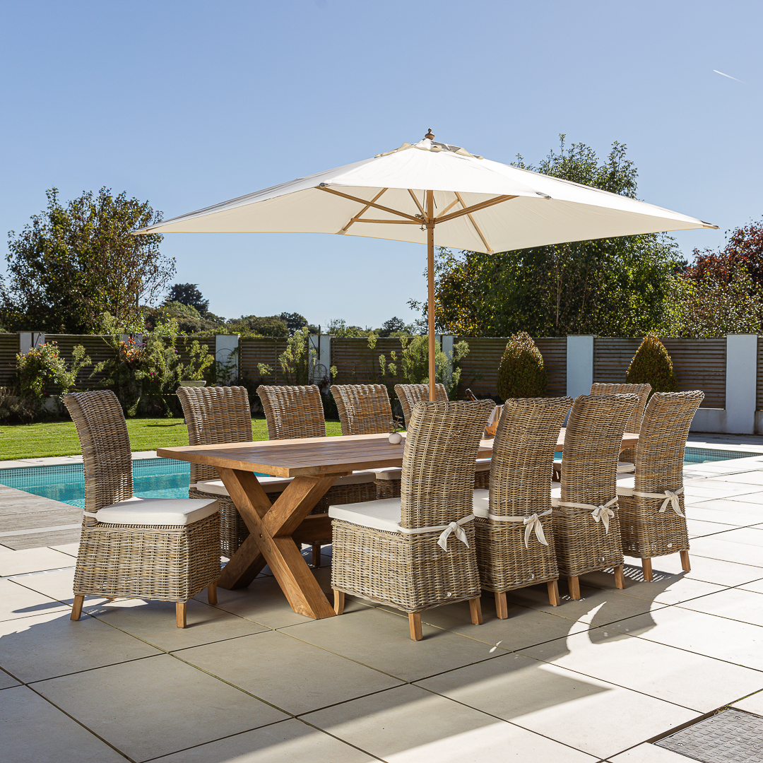 300cm Rectangular Natural Reclaimed Teak Cross Leg Outdoor Dining Table with 8 or 10 Natural Kubu Wicker Chairs