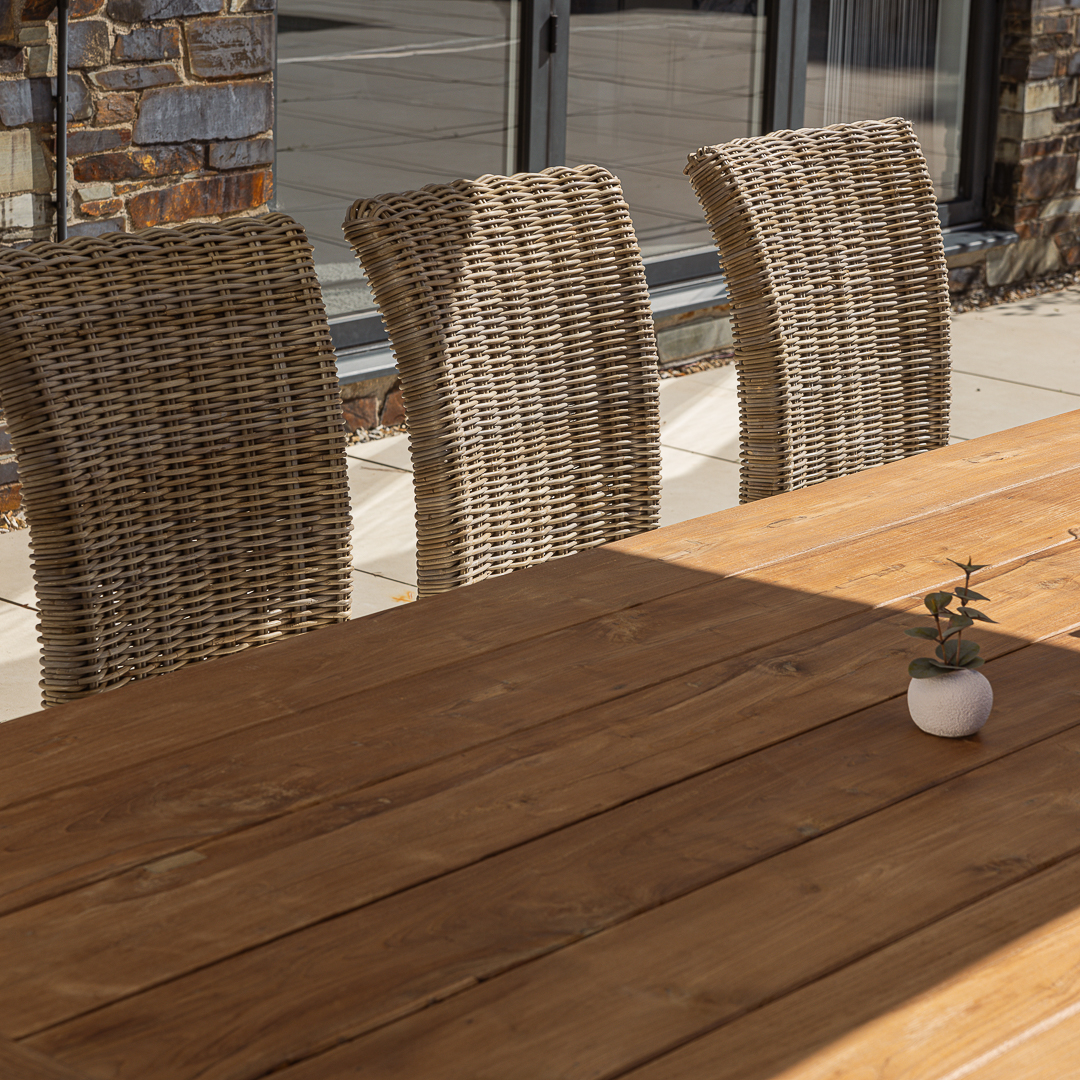 300cm Rectangular Natural Reclaimed Teak Straight Leg Outdoor Dining Table with 8 or 10 Natural Kubu Wicker ChairsIn stock