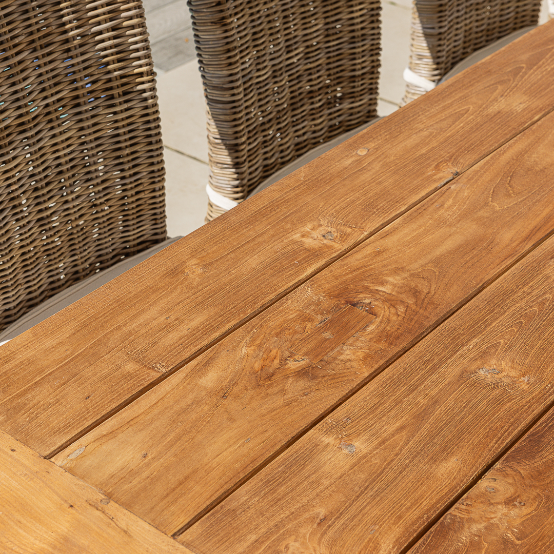 240cm Rectangular Natural Reclaimed Teak Straight Leg Outdoor Dining Table with 6 or 8 Natural Kubu Wicker ChairsIn stock