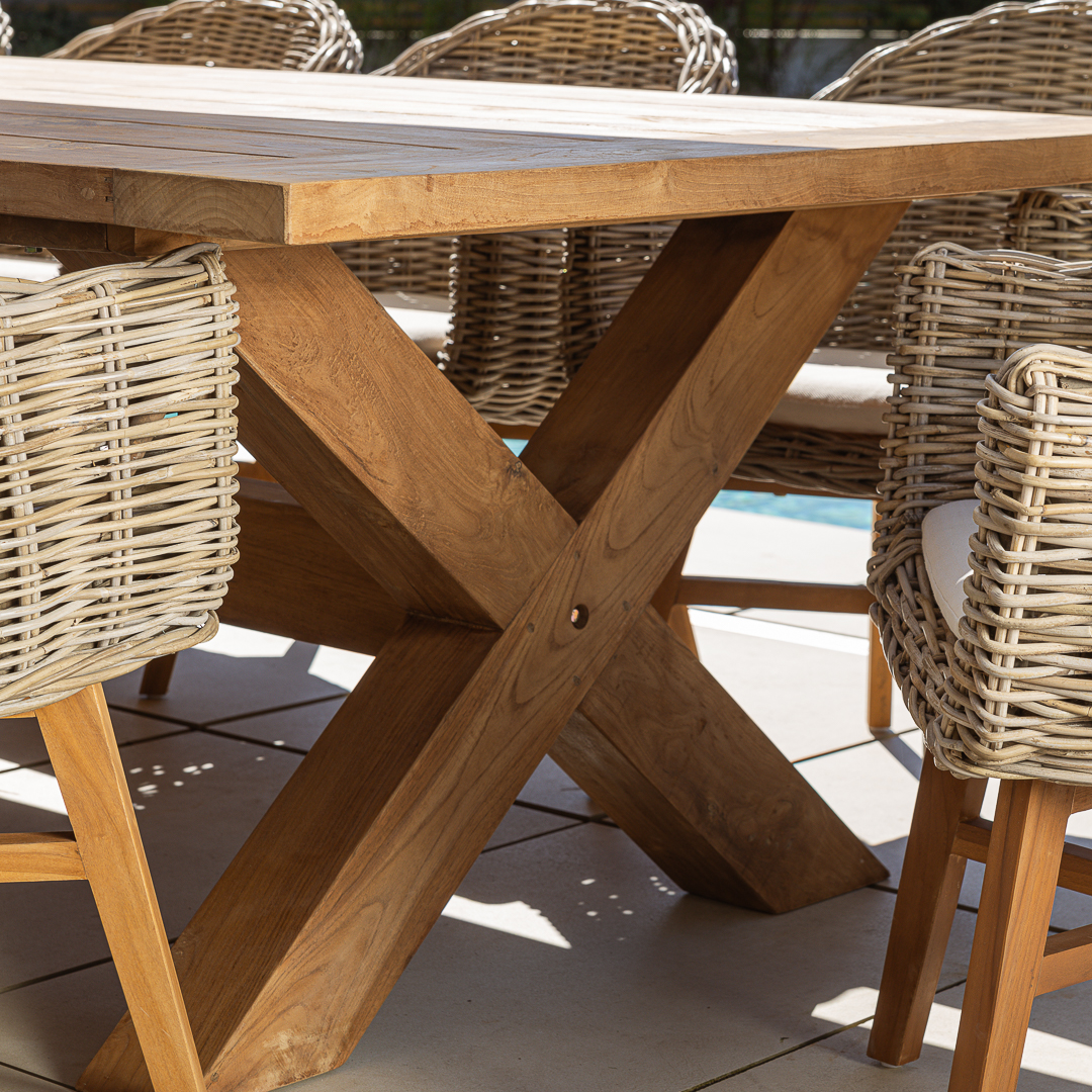 240cm Rectangular Natural Reclaimed Teak Cross Leg Outdoor Dining Table with 6 or 8 Natural Kubu Wicker ChairsIn stock