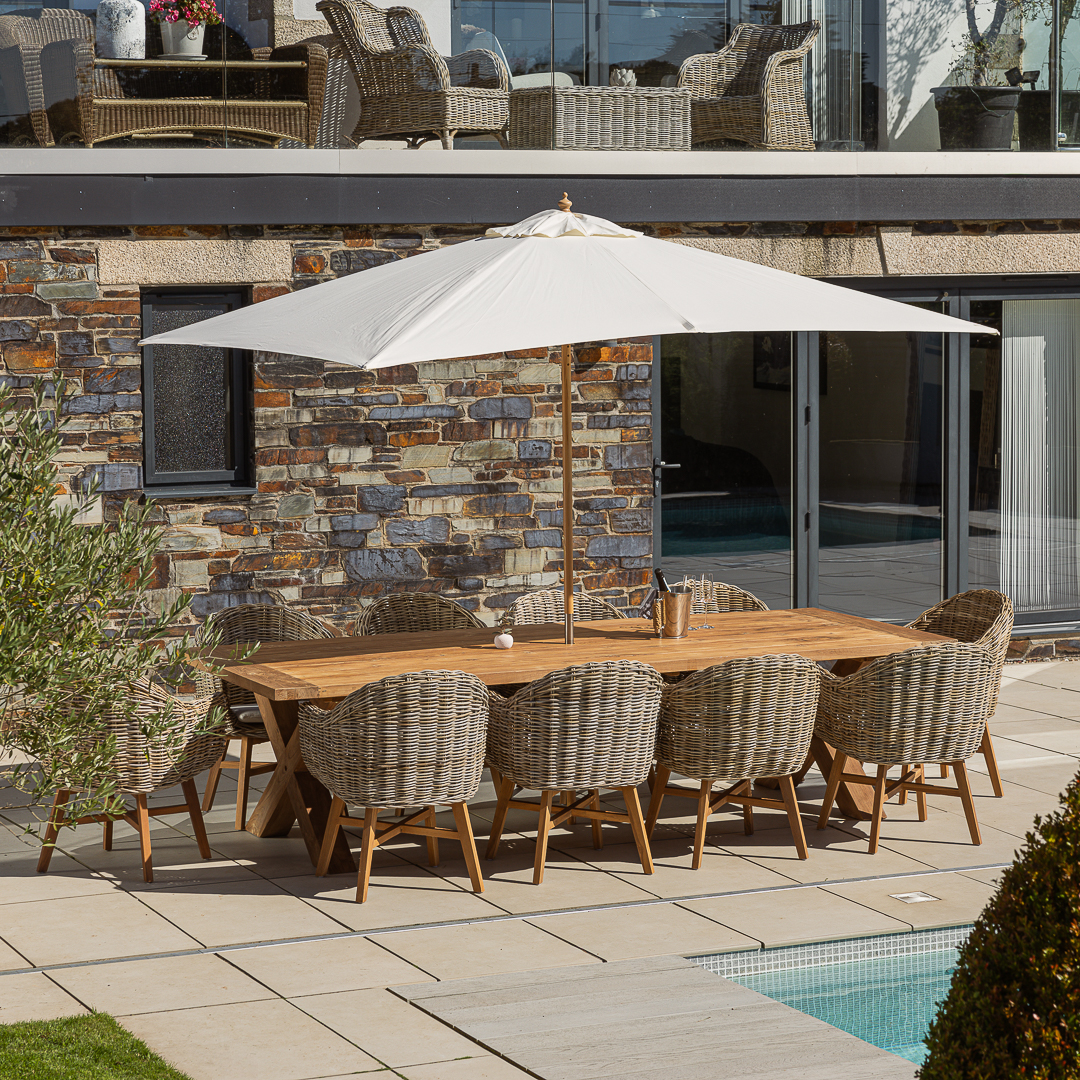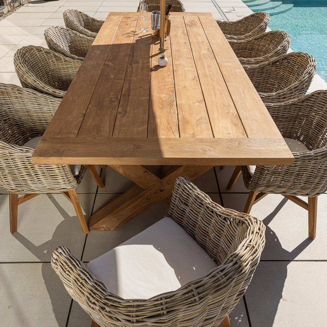 300cm Rectangular Natural Reclaimed Teak Cross Leg Outdoor Dining Table with 8 or 10 Natural Kubu Wicker ChairsIn stock