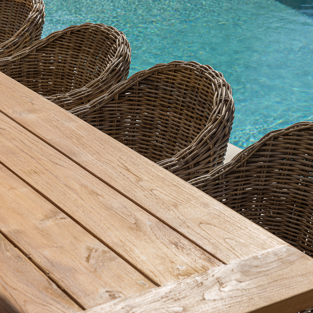 240cm Rectangular Natural Reclaimed Teak Straight Leg Outdoor Dining Table with 6 or 8 Natural Kubu Wicker ChairsIn stock