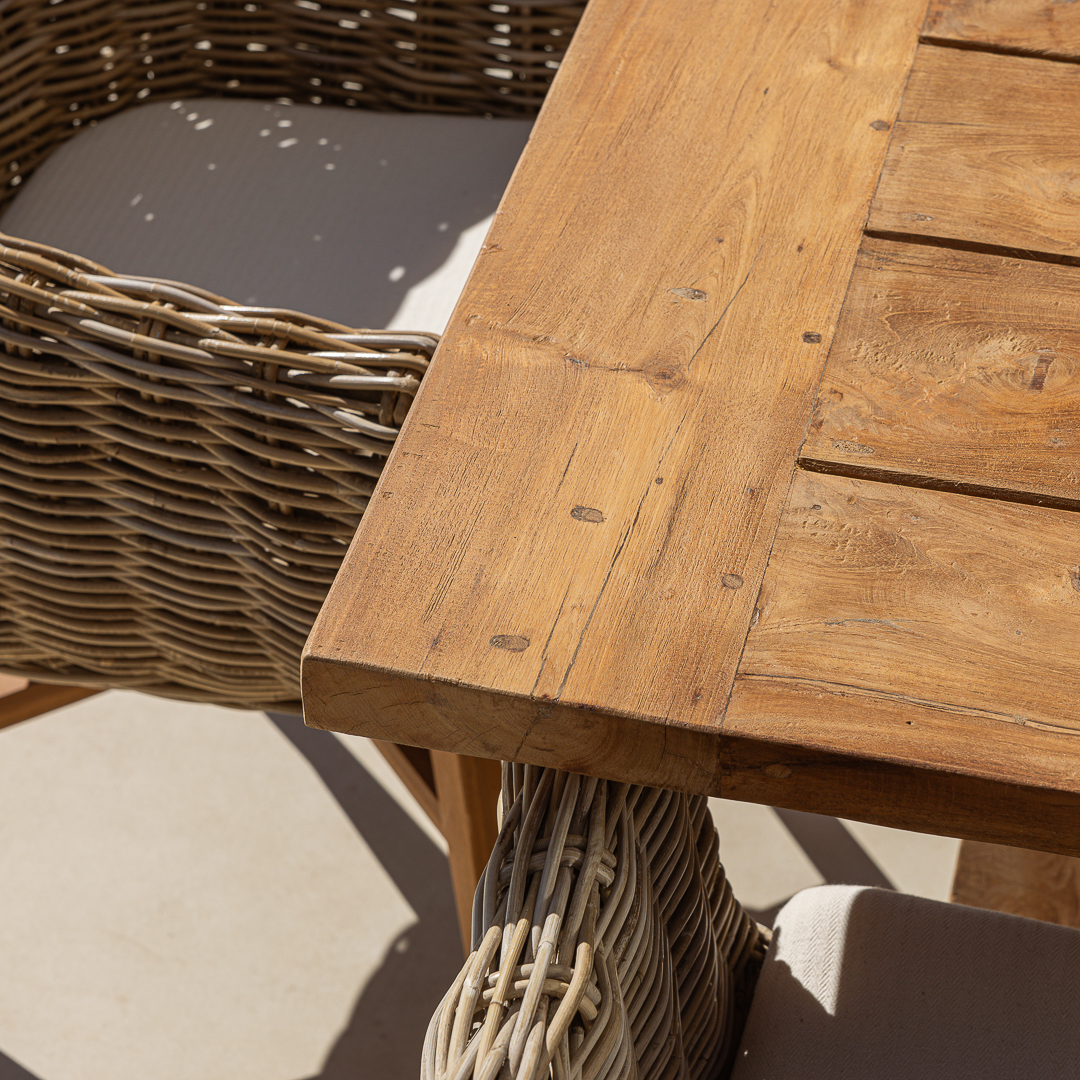 160cm Rectangular Natural Reclaimed Teak Straight Leg Outdoor Dining Table with 4 or 6 Natural Kubu Wicker ChairsIn stock